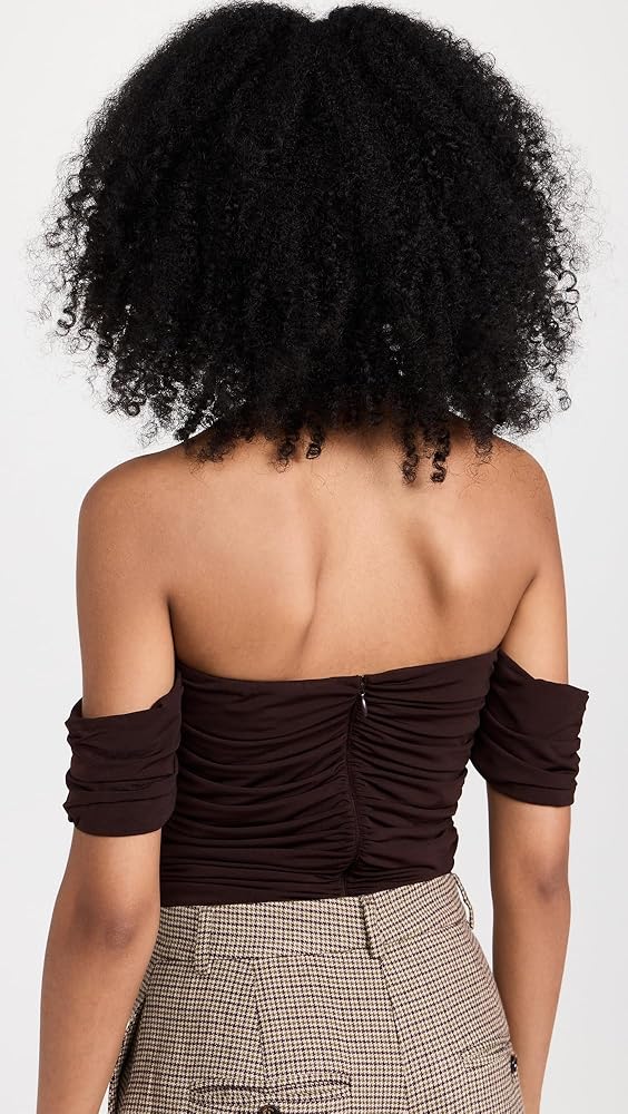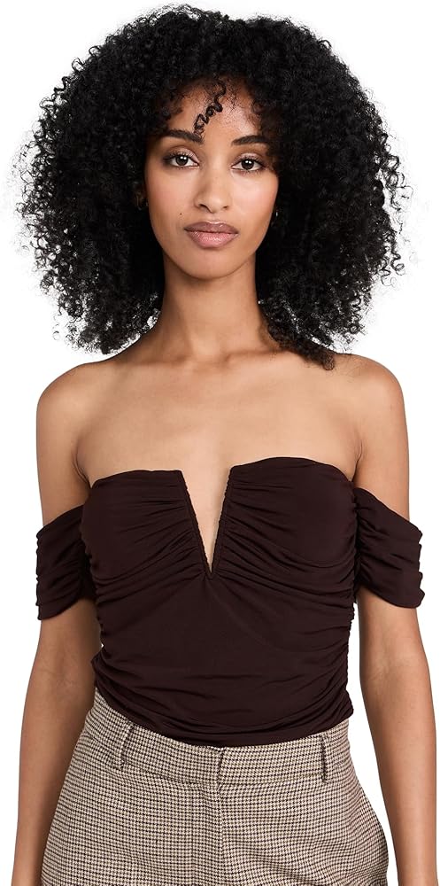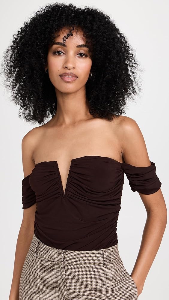 - كشكشة على كامل الجسم، خط عنق بدون أكتاف مع فتحة على شكل حرف V منظمة، ظهر ثونغ وقطعة قماشية كبس