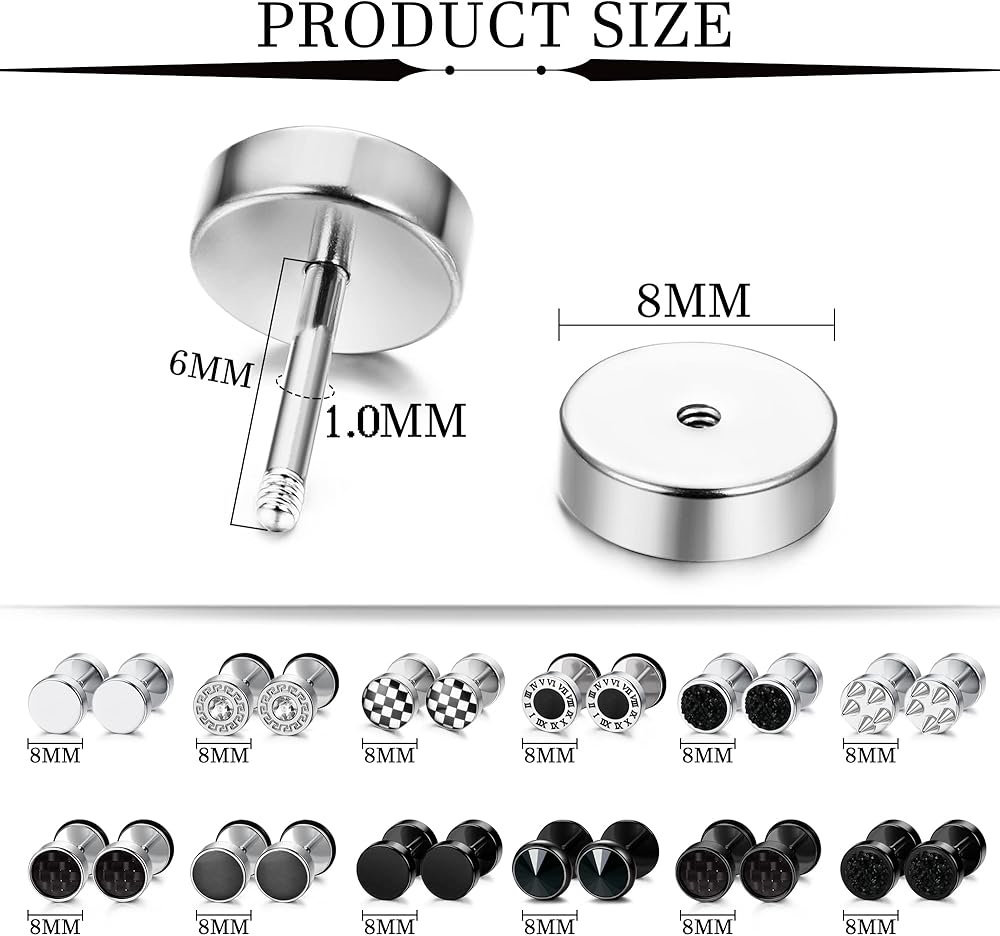 【الحجم والتصميم】المقياس: 18 جم = 1.0 مم، القطر الداخلي 5/16 بوصة = 8 مم، طول القضيب القابل للارتداء 6 مم. المقاس الشائع مناسب لكل من الرجال والنساء. إذا كنت تحب نمط الشرير، فإن هذه الأقراط الرائعة رائعة للارتداء اليومي ويسهل تنسيقه بشكل خاص مع الملابس الكاجوال.