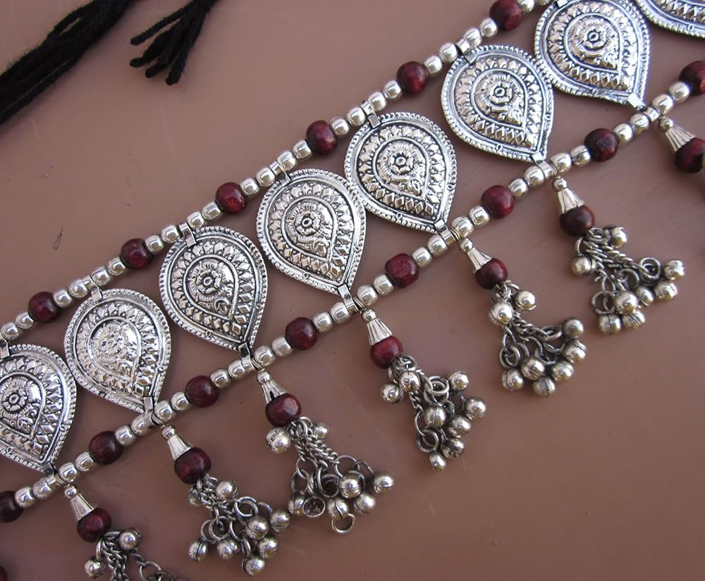 - مطرز على الحبل مع خرز معدني وخشبي مع شراشيب معدنية ساحرة على شكل جرس