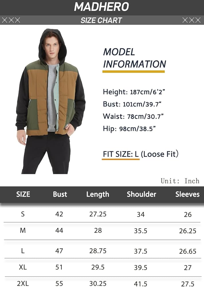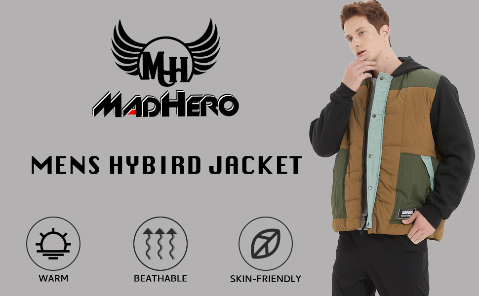 【Warm&Water-Resistant】Mens hybird jackets designed with puffer body and knit sleeves. Water-resistant body parts with quilted panels to stay warm; Stretchy fabric on sleeves and hood for movement