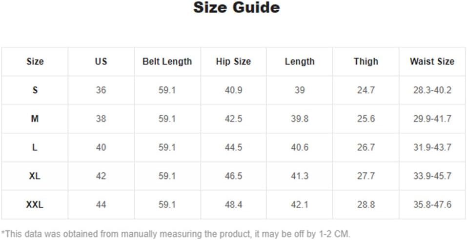 Large: Belt Length: 59.1", Hip Size: 44.5", Length: 40.6", Thigh: 26.7", Waist Size: 31.9-43.7"