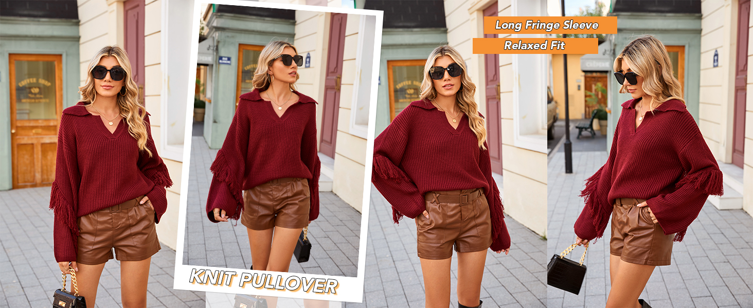 تتميز السترات الصوفية المحبوكة بما يلي: رقبة على شكل حرف V، وأكمام طويلة ذات شراشيب مثيرة، وأكتاف منسدلة، وقمصان علوية، ومريحة، وتصميم كاجوال فضفاض، وبلوزة محبوكة بلون سادة