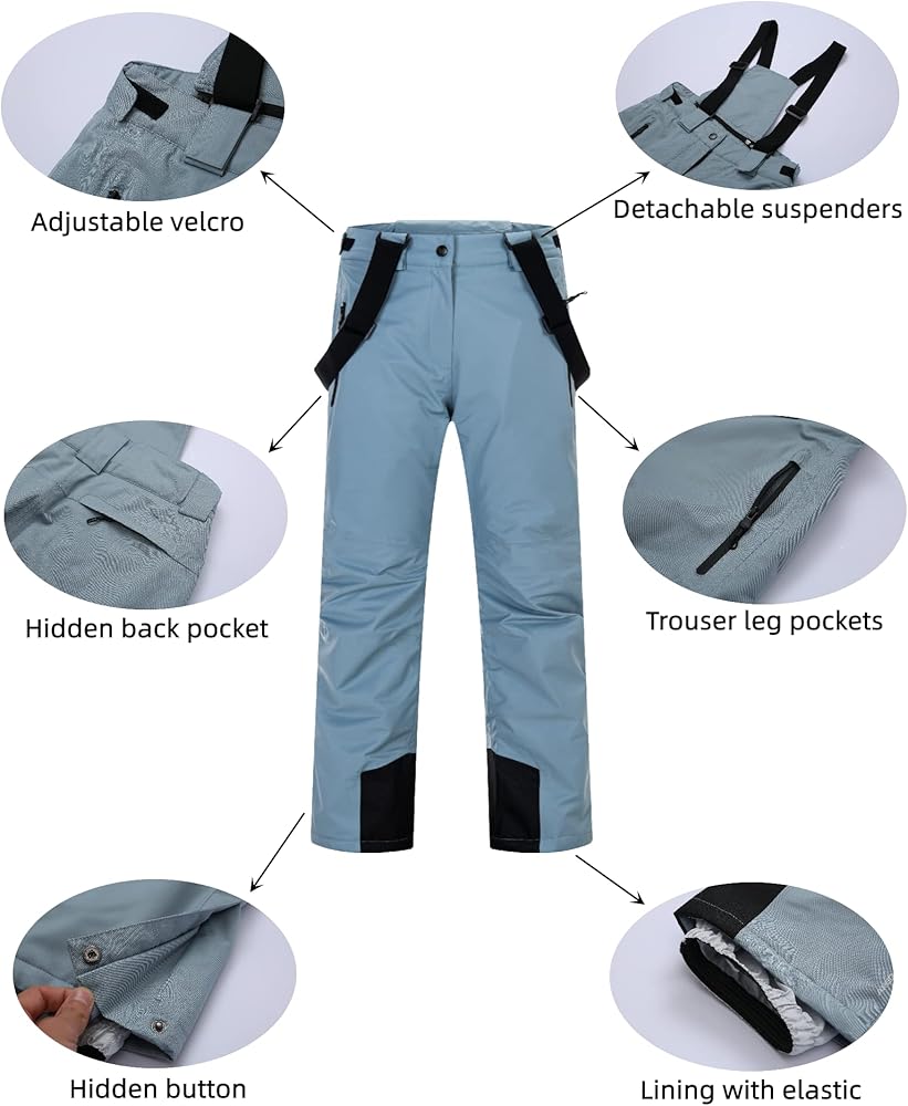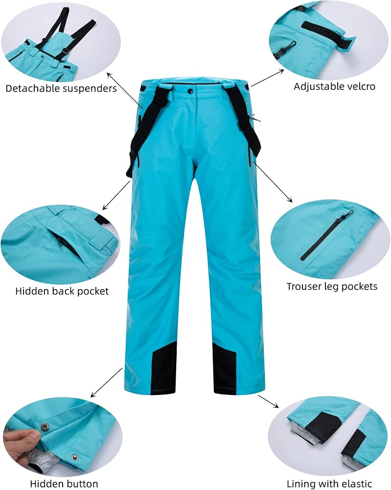 • مقاومة للماء: سراويل التزلج النسائية مصنوعة من تكنولوجيا نسيج مقاومة للماء عالية الأداء، وهي ناعمة ومريحة وصديقة للبشرة. جميع الدرزات المهمة معززة ومختومة، وتمنع بشكل فعال غزو المطر والثلج، وتمنع تسرب الماء، وليس من السهل ارتداؤها.