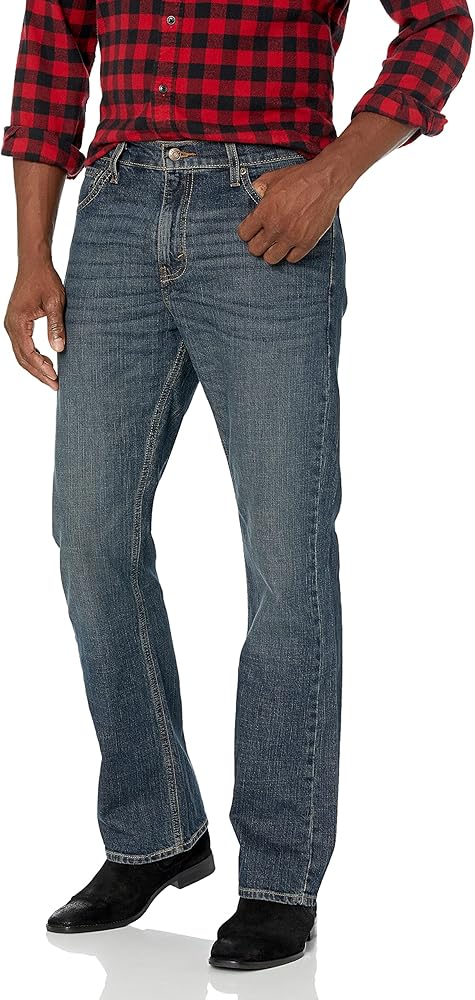 بنطلون جينز متوسط الارتفاع مريح من خلال الفخذ مع ساق جزمة.