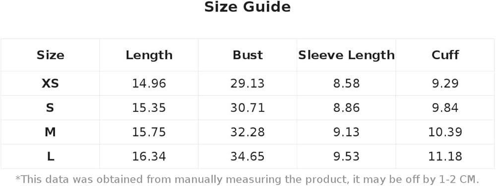 S:Bust:30.7IN,Cuff:9.8IN,Length:15.4IN,Sleeve Length:8.9IN