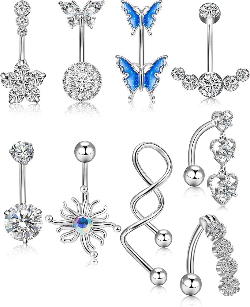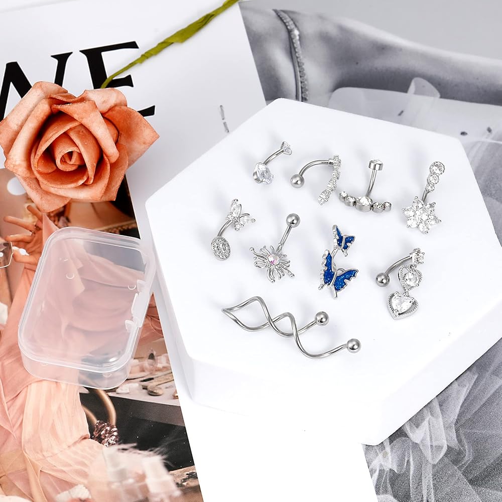 مجموعات بأسعار معقولة - إجمالي 9 قطع من حلقات سرة البطن، تأتي مع صندوق بلاستيكي شفاف. بما في ذلك حلقات السرة الحلزونية وحلقات السرة على شكل فراشة وخواتم سرة دوار الشمس وغيرها من حلقات ثقب البطن.