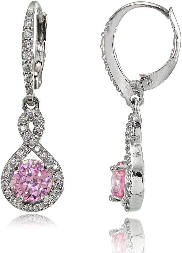 • These dangle earrings display sparkling round shape light pink cubic zirconia stones in the center of an infinity design accented by smaller clear CZ stones. These infinity figure 8's drop gracefully in dangling style off CZ studded leverback closures. These CZ drop earrings and lever back drop earrings are great earrings for women and teen girls. These cubic zirconia earrings are an excellent fashion option for your CZ jewelry collection.