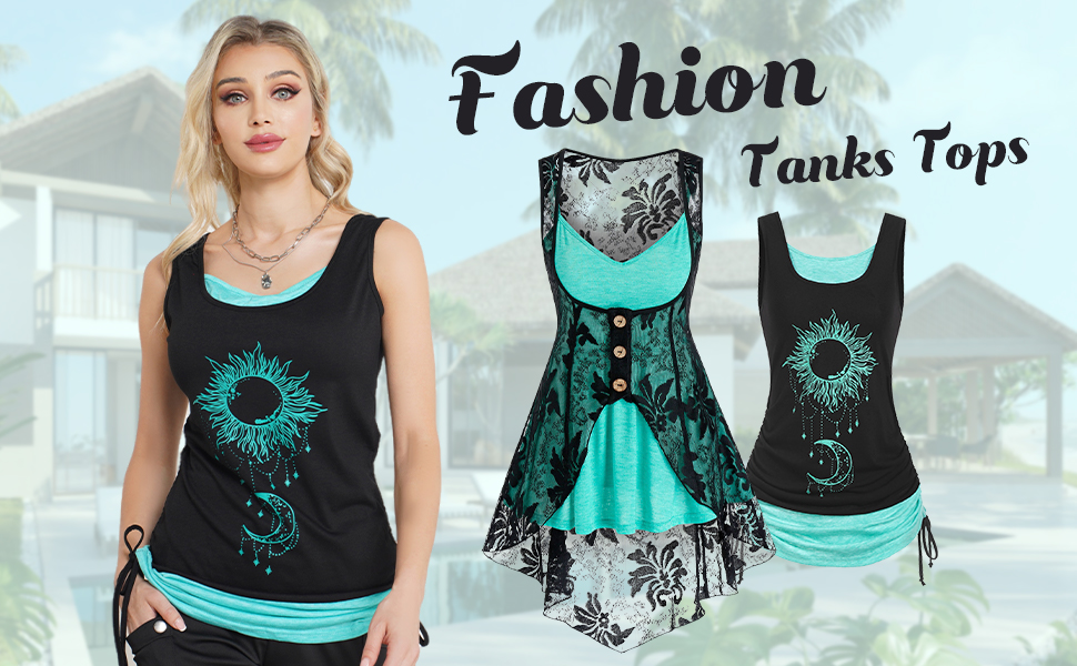 【نمط 2-قمصان نسائية على شكل جمجمة قوطية】تضفي القصة الأمامية المنخفضة النمط الجذاب لهذا التانك ذو الطبقة المثالية في صورة ظلية غير متماثلة مع ألواح من الدانتيل على شكل جمجمة، ورقبة مربعة أنيقة، وخصر مرتفع طويل، وحلقات على شكل حرف O في الأشرطة لبعض البريق المعدني.