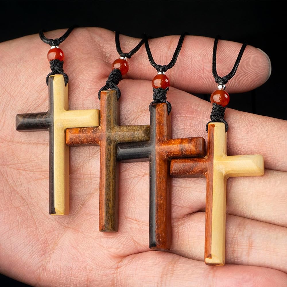 • Purely Handmade From Natural Wood - Our wooden cross necklaces come in 4 styles, namely "Ebony & Rosewood, Rosewood & Boxwood, Rosewood & Green Sandalwood, Ebony & Boxwood". Each style is made of 4 types of pure natural wood and is made of exquisite small pendants polished and carved by hand using the mortise and tenon process. Each cross has different colors and textures and is a unique work of art.