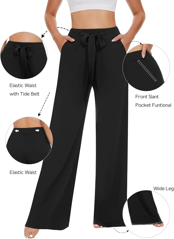 Stylish & Functionality: Waist of wide leg yoga pants features a tie design, allowing for flexible adjustment. Stretch waist and plus elegant bow design of palazzo pants creates a sophisticated and ultra-stylish ensemble.Two outside pockets can be put for cellphone or any essentials.