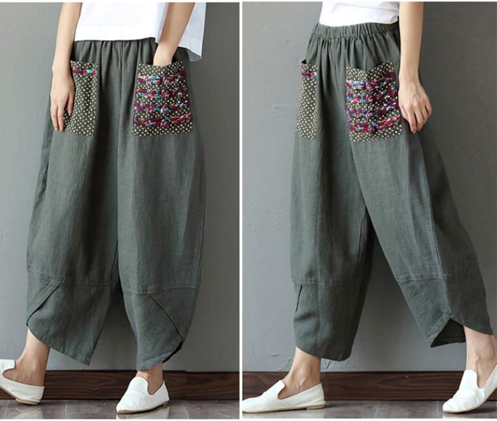المميزات: سراويل واسعة الساق للنساء بتصميم إغلاق الساق، سراويل حريم، خصر مرن، لون ثابت، جيبان جانبيان