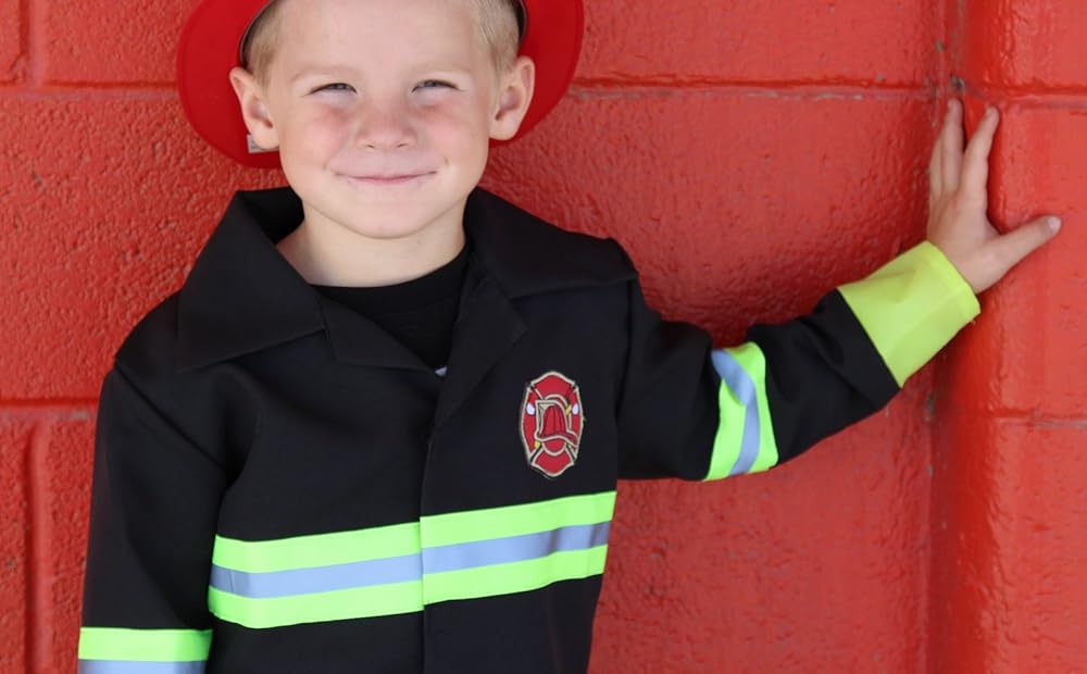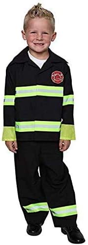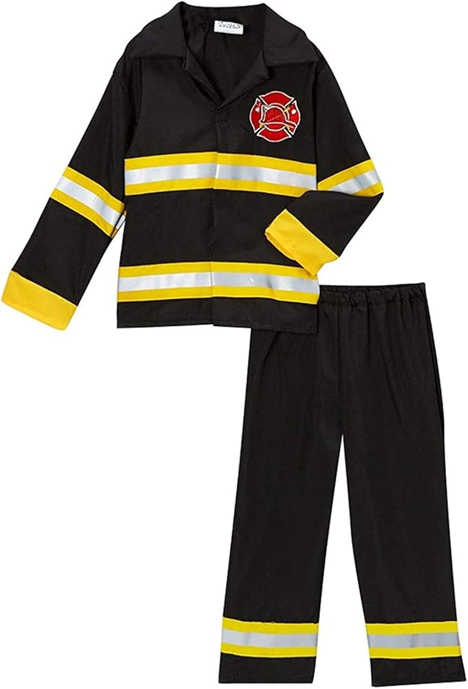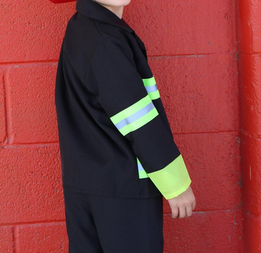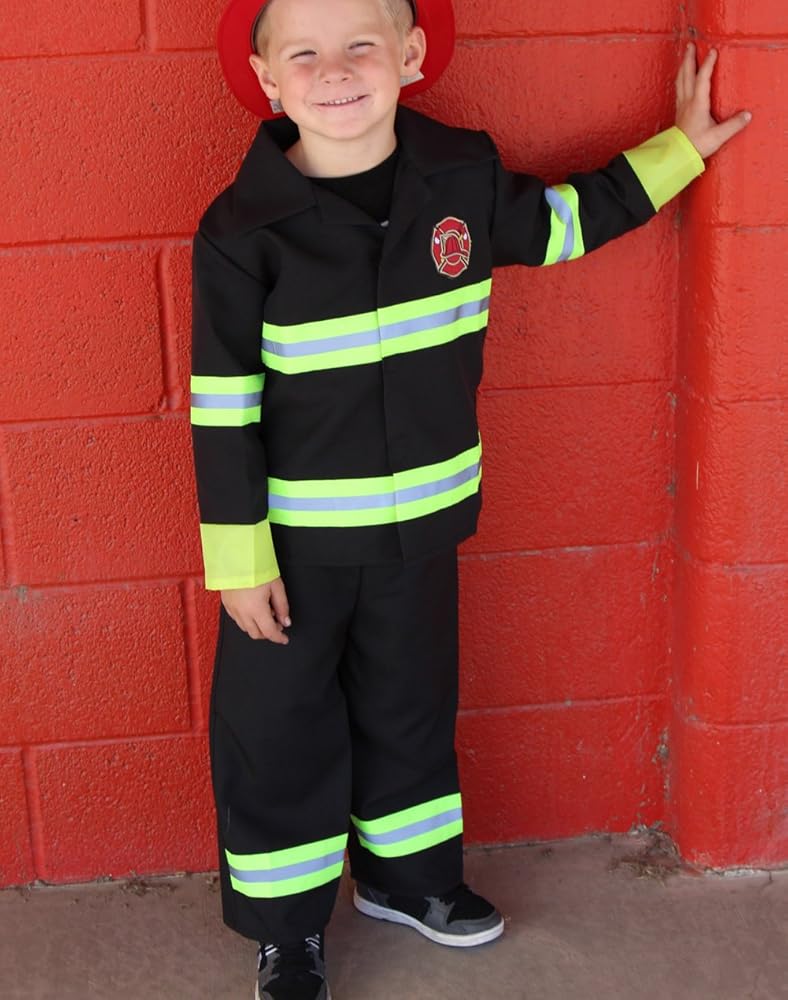 Our classic fireman costume is fun for everyday play or a fireman party. Your little hero will enjoy hours of fun. Black jacket with yellow/reflective trim. Screenprinted fire chief badge. Velcro front closure. Black pants with elastic waistband. Red rigid plastic fireman hat is included. 100% polyester. Hand wash, lay flat to dry. Do not iron. Imported.