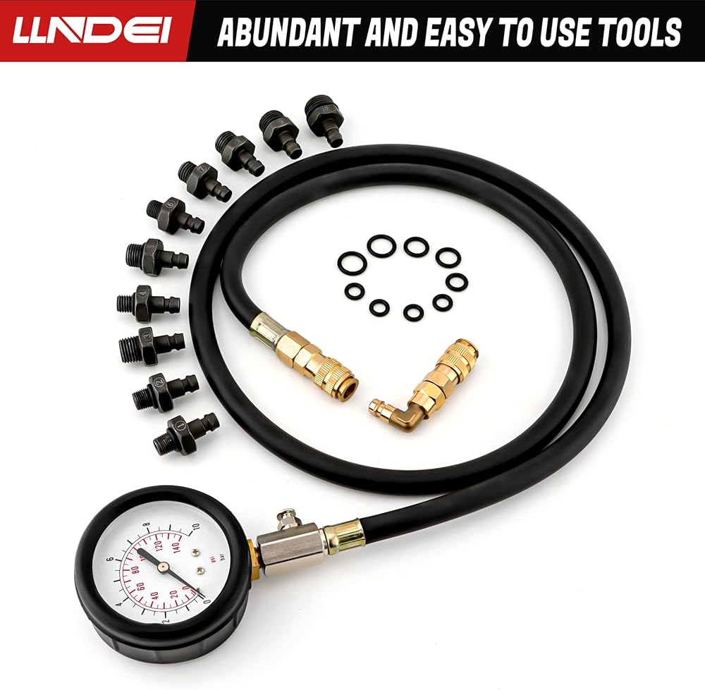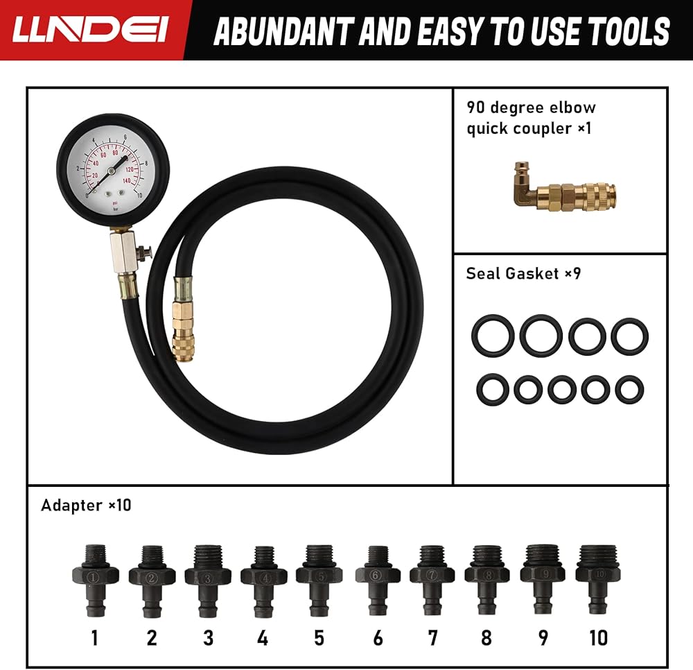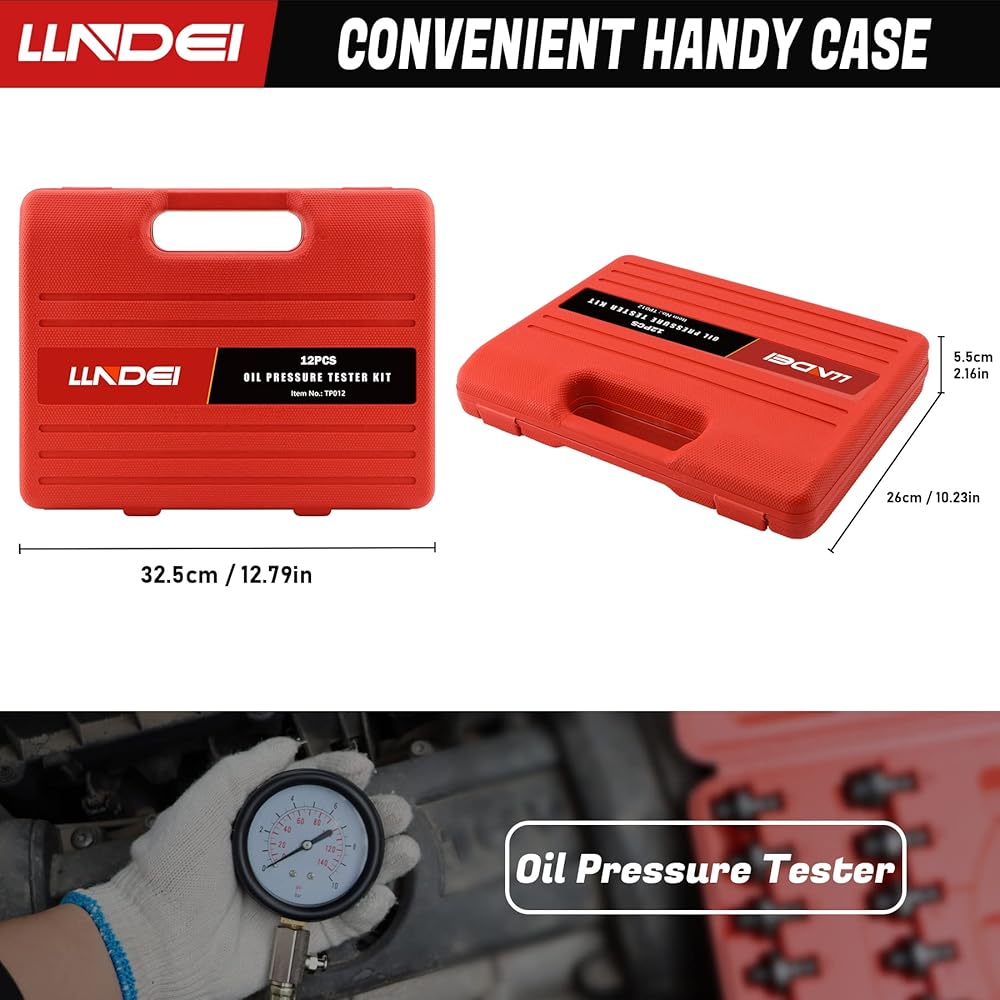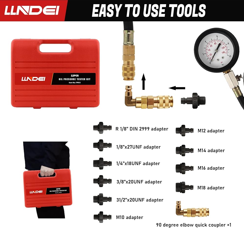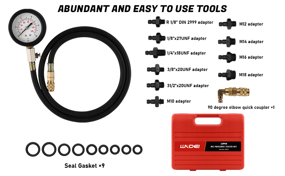 🚗INCLUDED: LLNDEI engine oil pressure tester kit is equipped with 1 piece oil pressure gauge with hose, 1 piece 90°elbow joint, 10 pieces steel coupling dapters and spare sealing washers, which are packed in a convenient box for transportation, storage and organization.