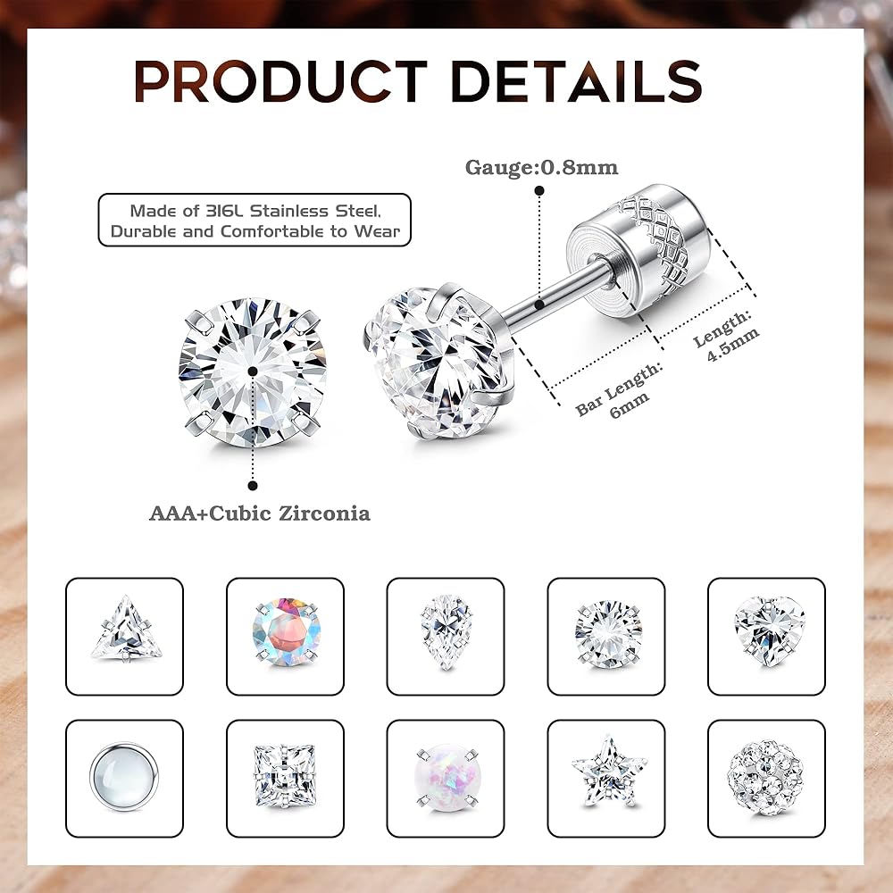 Subiceto 10 أزواج من الفولاذ المقاوم للصدأ مكعب زركونيا أقراط مجموعة للنساء الرجال المسمار الخلفي الأقراط أوبال جولة مربع القلب نجمة الكمثرى الكرة على شكل أقراط الماس فو تشيكوسلوفاكيا هيبوالرجينيك المسمار الأقراط ثقب المجوهرات 20 جرام