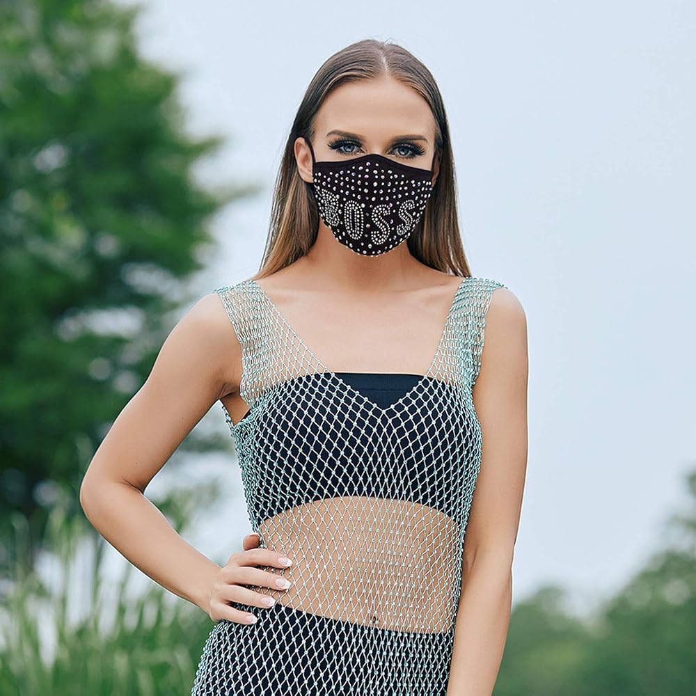 XuanAn Women Fashion Face Cover with Filter Anti Pollution Washable Adjustable Mouth Cover Bandanas Rhinestone Decorative Black (QUEEN), Medium