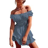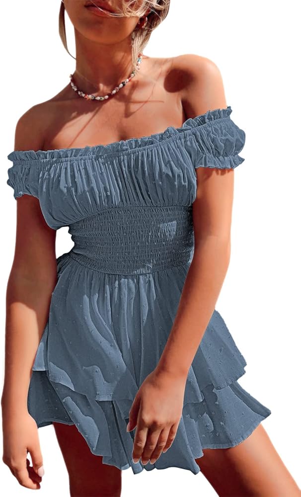 - Off shoulder boho rompers, short sleeve,pleated smocked waist,swiss dot, tiered ruffle skirt overlay, above knee length, mini jumpsuit