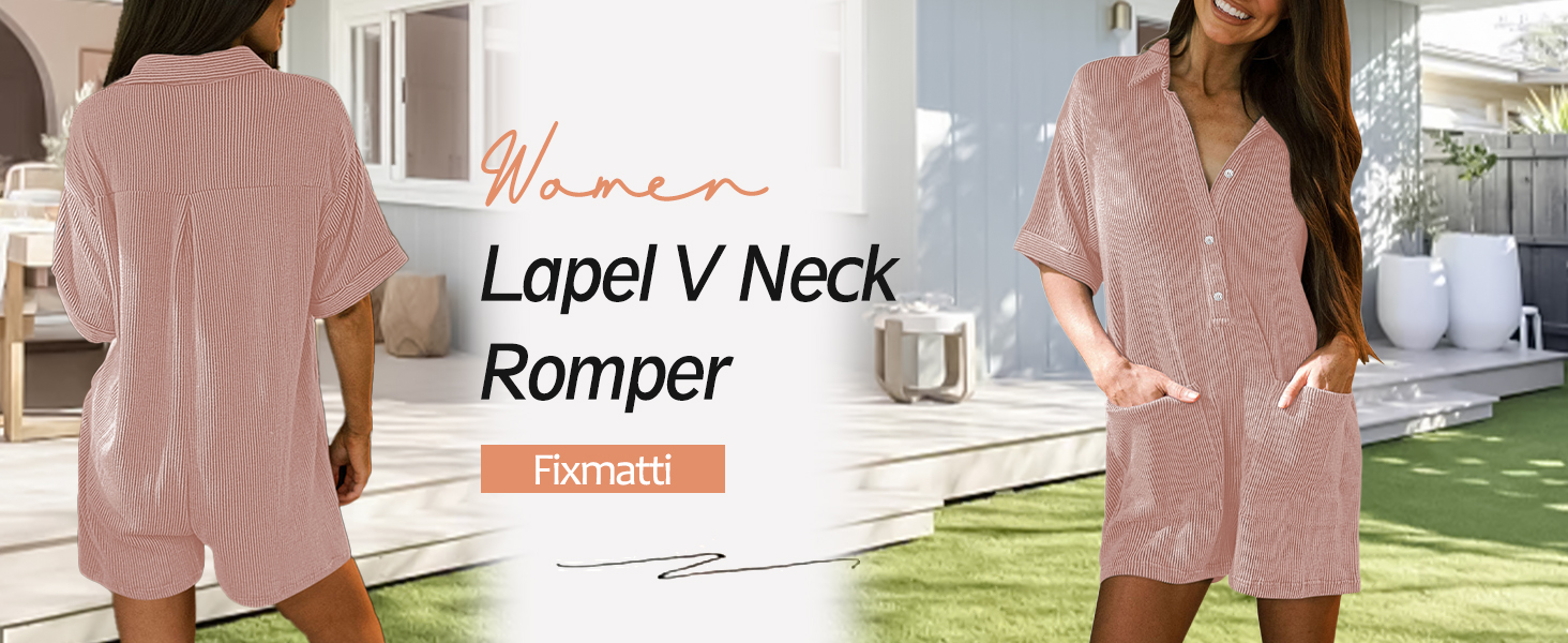 - V neck turn down collar lapel rompers short sleeve button down front one piece outfit casual jumpsuits