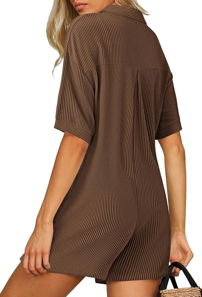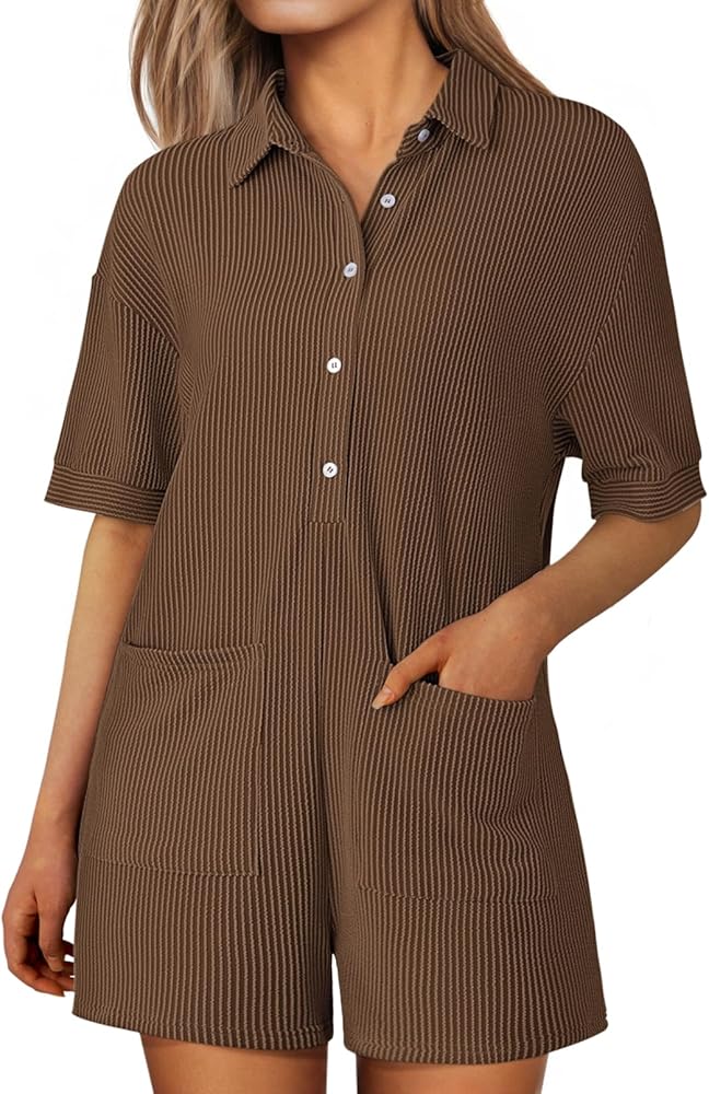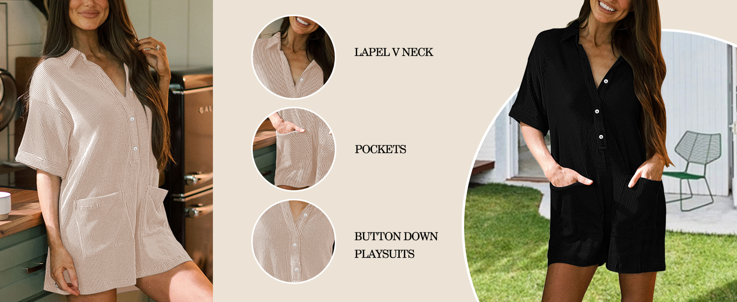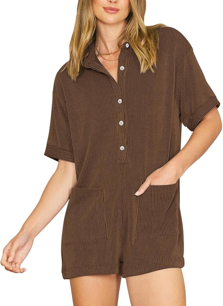 - Button down romper for women, short sleeve ribbed mini jumpsuit