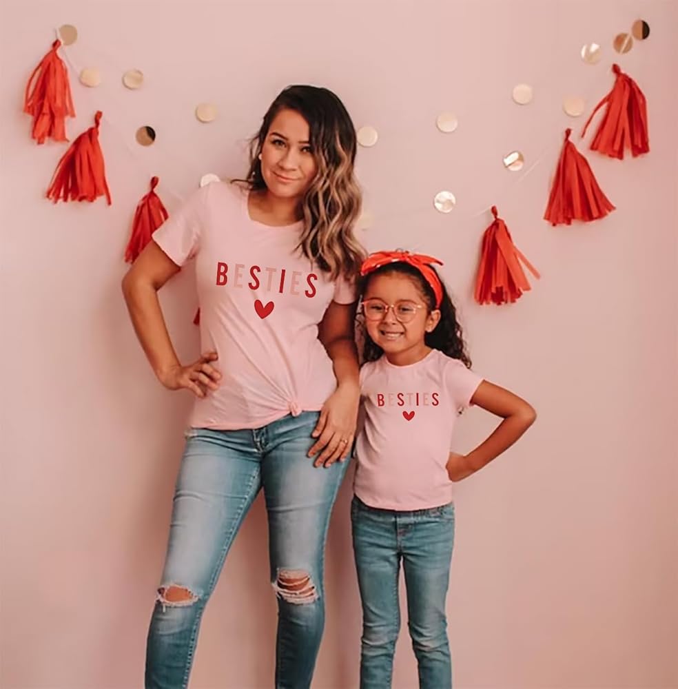 Pretty Besties Mommy and Me Matching Shirts Cute Heart Graphic Valentine's Day Tee Shirt Mother and Daughter Valentine Gift Tops