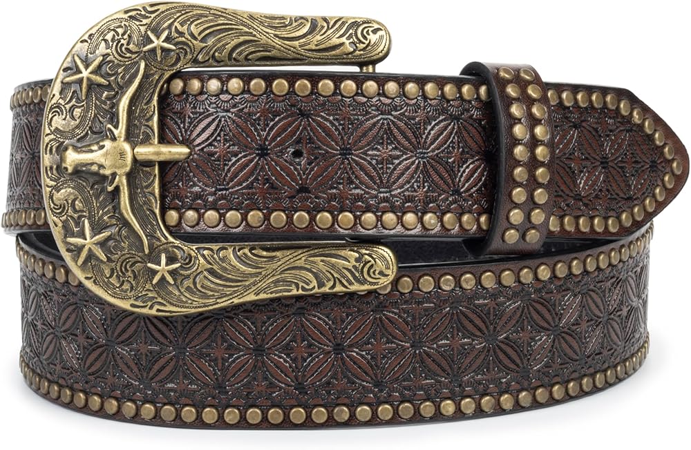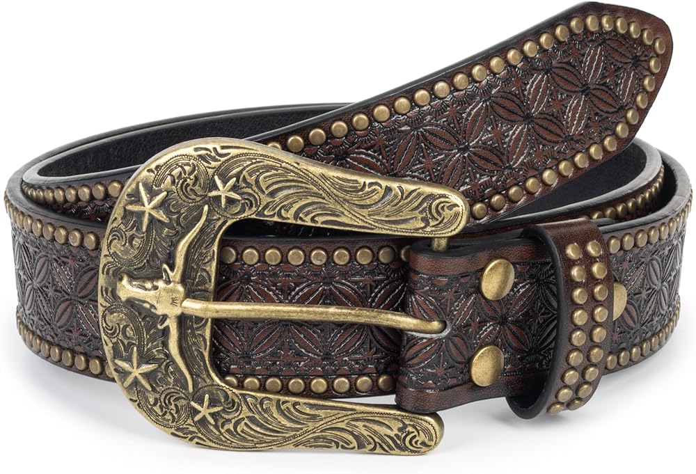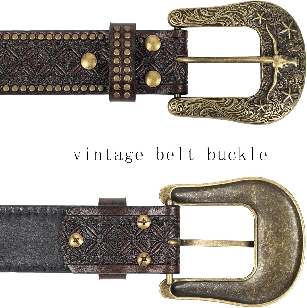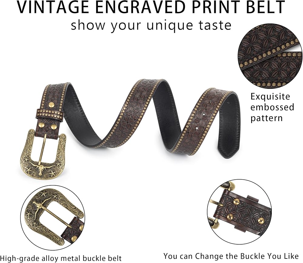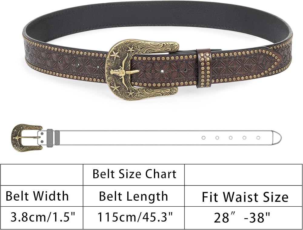 Women's Vintage Carved Flower Western Cowboy Belt with Rhinestones Buckle Stylish Casual Belts for Jean Pants