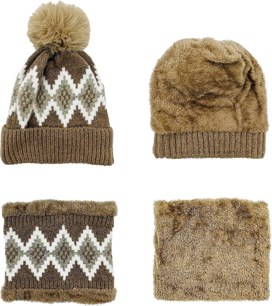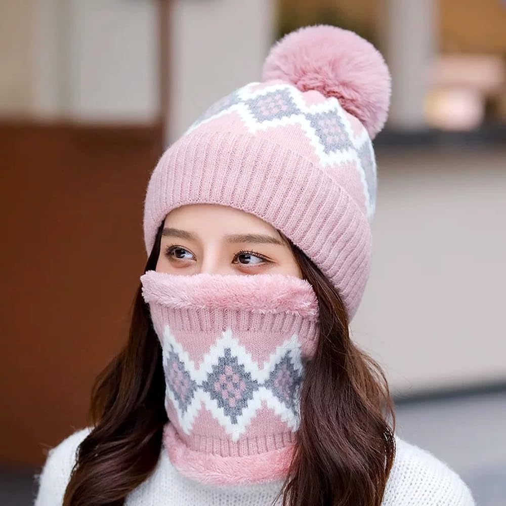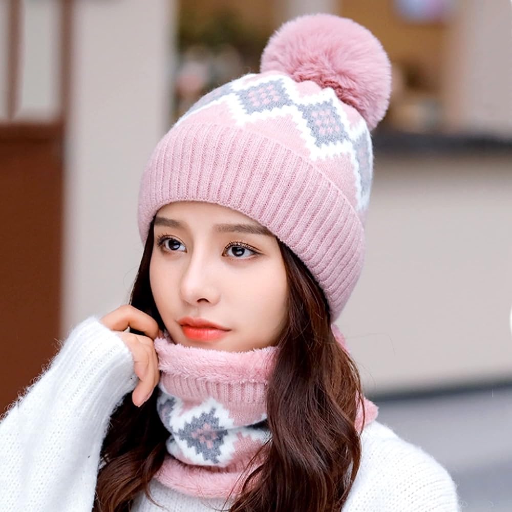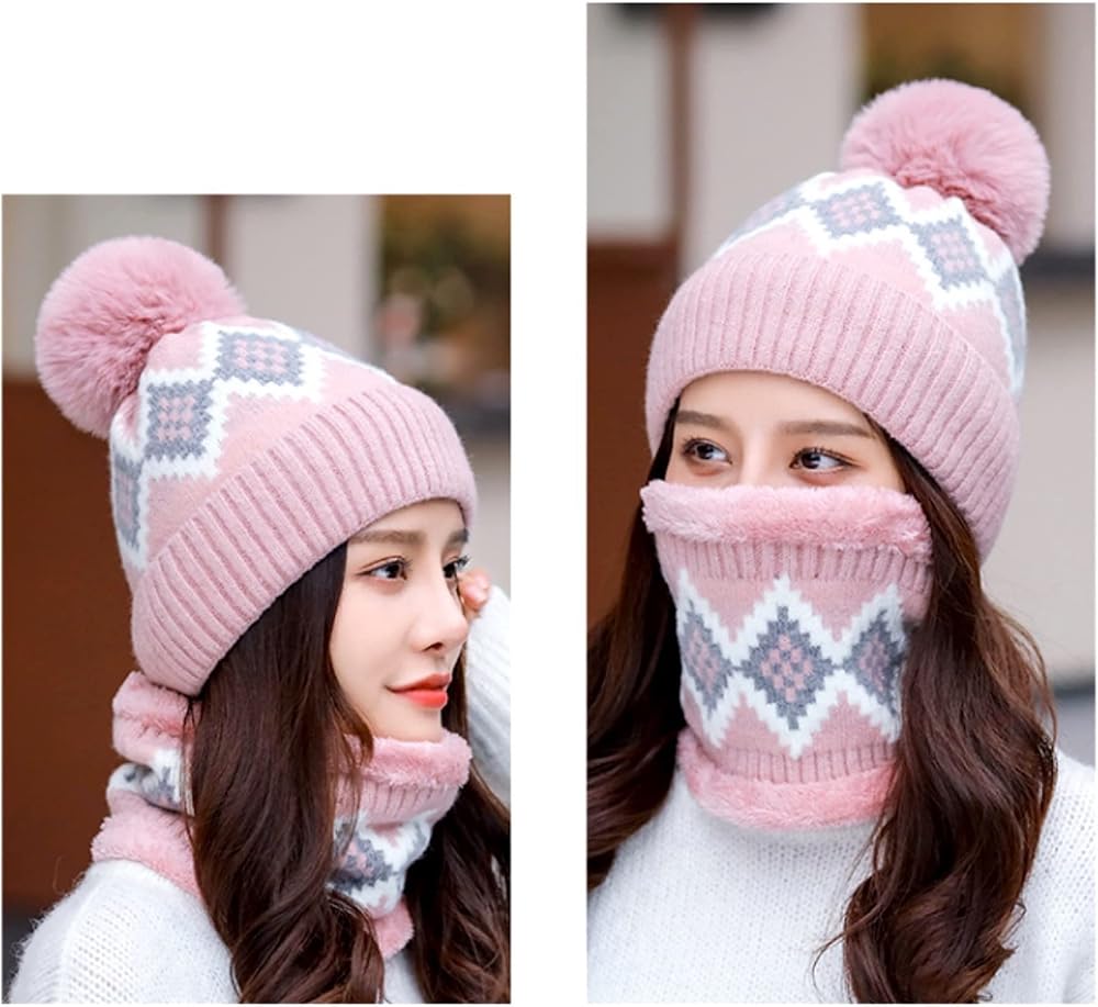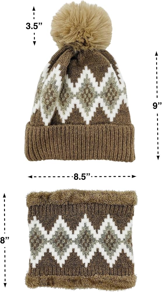 التصميم: قبعة صغيرة منسوجة من Pompom ووشاح أنبوبي للرقبة مع بطانة من الفرو الصناعي الغامض، مما يوفر المزيد من الدفء والراحة، ويمكن ارتداؤه بشكل منفصل أو معًا.