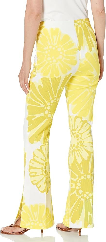The Byrony Pant has a wide leg with side slits for extra flare. It has side zip closure and is in a fun daisy print