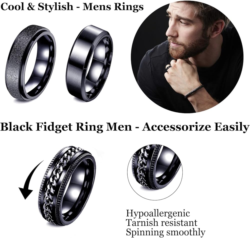 • 【متينة ومريحة】مصنوعة من الفولاذ المقاوم للصدأ المضاد للحساسية، حلقات الرجال السوداء مصقولة بدرجة عالية، وتدور بسلاسة، ولا تسبب الحساسية للجلد. الحجم 8-12. الراحة تناسب إصبعك.