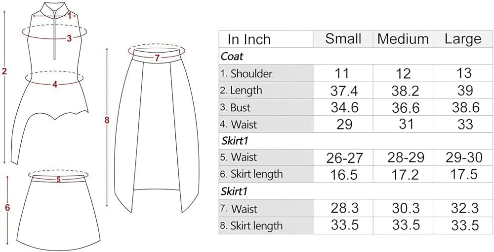 المقاس L: طول البلوزة: 99 سم، عرض الكتف: 31 سم، محيط الصدر: 98 سم، محيط الخصر: 83 سم، طول التنورة القصيرة: 44.4 سم، محيط الخصر: 75-78 سم، تنورة أطول: 85 سم، محيط الخصر: 82 سم