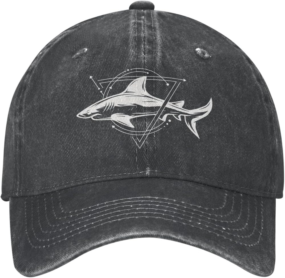 VunKo Cool Shark Black Vintage Distressed Adjustable Washed Denim Cotton Low Profile Mens Dad Trucker Hat Black Fitted Baseball Ball Cap for Men Unisex Headwear, Black, One size