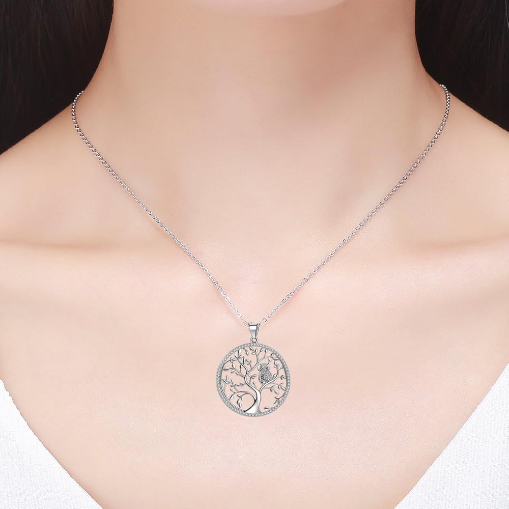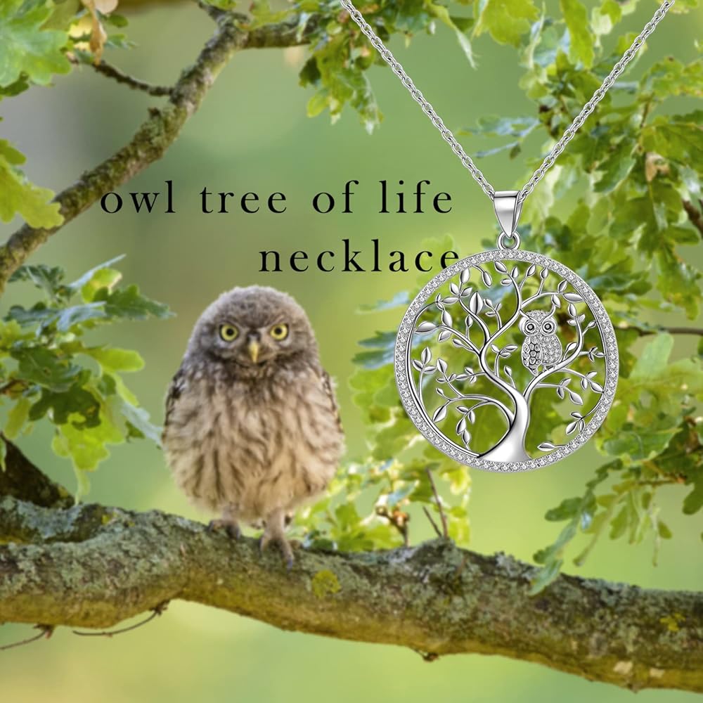 قلادة من الفضة الاسترليني عيار 925 على شكل شجرة الحياة على شكل بومة مع سلسلة بطول 18 بوصة