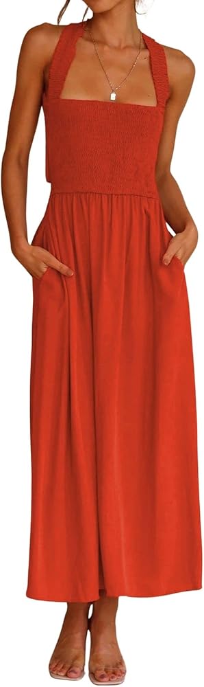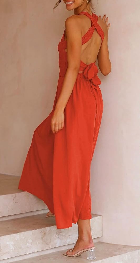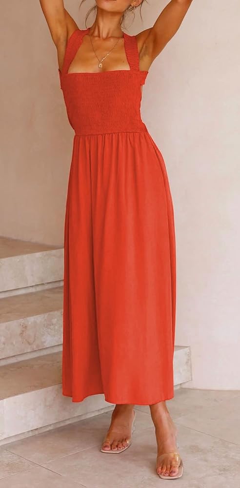 Women Sexy Spaghetti Strap Cut out Smocked Dress Party Backless Flowy Midi Dress with Pocket Polyester, Linen Stretchy elastic bust Features: Spaghetti straps/ Square neck/ Crisscross and hollow out back/ Backless with bow tie knot/ Stretchy smocked bust/ High waisted/ 2 Side pockets/ Mid long length Versatile dress: This midi dress is perfect for women and ladies as weekend going out casual smocked straps mid long dress, evening party night club bar elastic bust high rise slip dress, summer holiday vacation beach sundress ruffle flowy dress, cocktail cutout midi dress and so on. Solid color- orange, brown, black