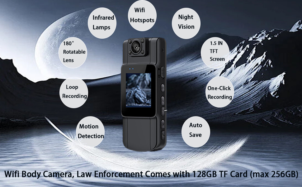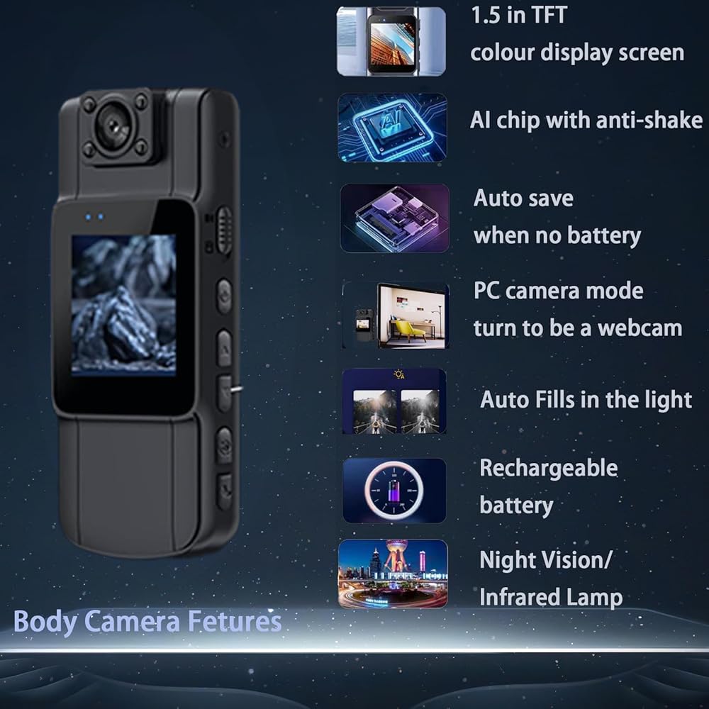 • عدسة دوارة 180 درجة ودقة HD 2K: كاميرا الجسم مجهزة بعدسة دوارة 180 درجة، و4 مصابيح بالأشعة تحت الحمراء ورؤية ليلية يمكنها التقاط تفاصيل أكثر وضوحًا حتى في الليل، ودقة فيديو 2K HD، ودقة صورة 1.3M-40M و1.5 ستوفر لك شاشة عرض TFT ملونة مقاس بوصة والتي تدعم التشغيل المحلي صورة أكثر واقعية وحيوية، وهي رائعة لالتقاط بعض اللحظات المهمة للأفراد والمدنيين والشرطة