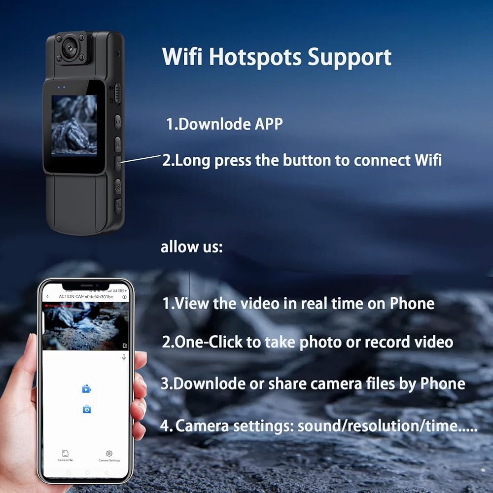 • التحكم في التطبيق عبر توصيل نقاط اتصال واي فاي: فقط قم بتحميل تطبيق الهاتف والاتصال بنقاط اتصال واي فاي لهذه الكاميرا، يمكننا تسجيل وعرض الفيديو في الوقت الحقيقي على الهاتف، مقارنة بالكاميرات الأخرى التي تقتصر على شاشات العرض الصغيرة، جسمنا المطور يمكن للكاميرا تخفيف إجهاد العين. علاوة على ذلك، يمكنك ضبط الدقة وتعويض التعرض والوقت والمزيد على هاتفك مباشرةً. (لا يمكن استخدام نقطة اتصال Wifi هذه للوصول إلى الإنترنت)
