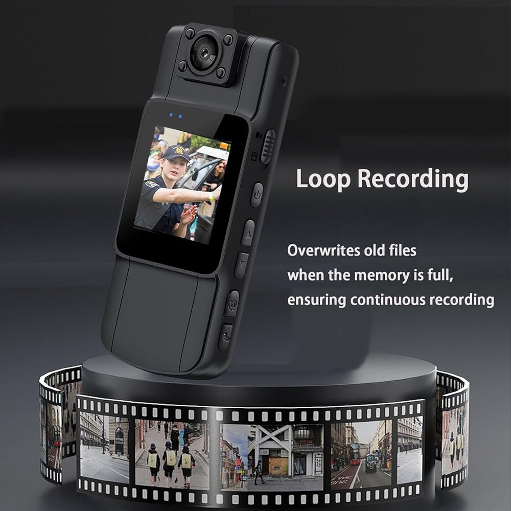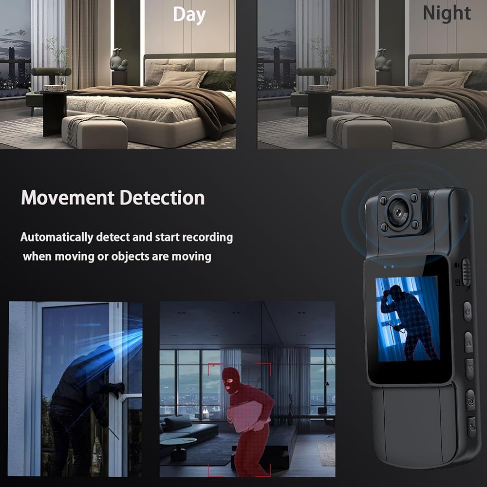 • تسجيل الحلقة واكتشاف الحركة: تأتي كاميرات الجسم هذه مع بطاقة TF سعة 128 جيجابايت ومزودة ببطارية ليثيوم قابلة لإعادة الشحن، ويمكنك استخدامها طالما كان هناك بنك طاقة (جهد USB 5 فولت، التيار > 1 أمبير). إلى جانب ذلك، تدعم كاميرا الجسم الشخصية هذه الاكتشاف التلقائي وبدء التسجيل عند الحركة أو تحرك الأشياء. لذا فإن كاميرات الفيديو المثبتة على الجسم تعتبر أيضًا مثالية لحالات الطوارئ التي تتطلب تسجيلًا سريعًا