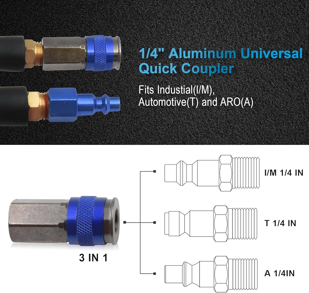 • ✔️سهل الاستخدام --- قم بتوصيل خرطوم الهواء هذا بضاغط الهواء مباشرة. تتميز قارنة التوصيل السريعة العالمية المصنوعة من الألومنيوم مقاس 1/4 بوصة بتصميم بسيط لتوصيل القابس بالضغط للتوصيل، كما أنها تقبل جميع الأنماط الثلاثة القياسية لأنواع قابس التبادل، الصناعية (I/M)، والسيارات (T)، وARO ( أ).