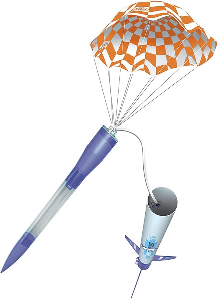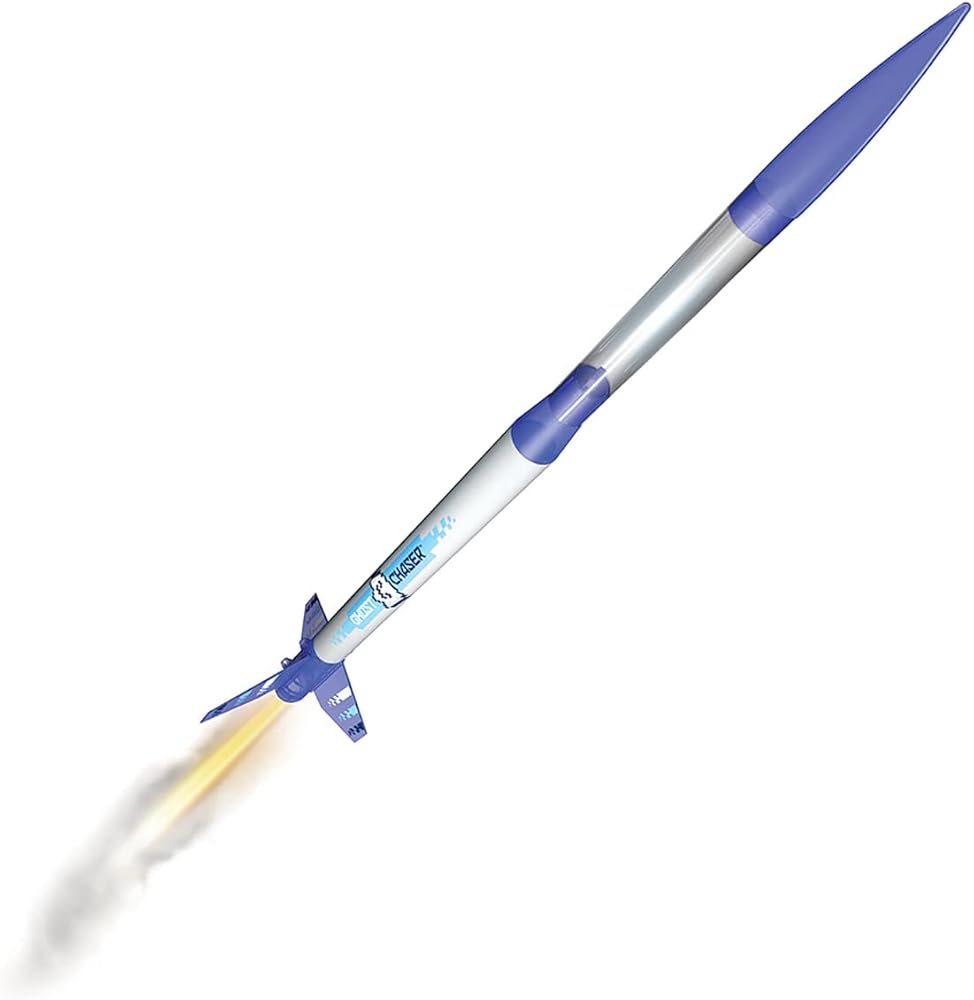 The hauntingly beautiful Estes 7300 Ghost Chaser Model Rocket Kit is a deceptively simple rocket that packs in a lot of fantastic features. Designed as an easy-to-build, snap-together, beginner-level kit, this model goes together quickly and easily in the hands of even the newest rocketeer. In no time you'll have a finished Estes Ghost Chaser Rocket 7300 standing nearly two feet tall with its striking silvery white main body tube and clear, five-inch payload section. A sleek transition separates the two tubes, reducing the rocket body from a standard 18mm BT20 to a svelte 13mm BT5. The blue translucent fins almost seem to glow when the light hits them. Shine that light through the semi-transparent engine mount, nosecone, and the mid-body transition and watch them glow eerily in blue, too. Since all Ghost Chaser components are pre-finished, there's no sanding or painting required. A clever system of slots, tabs and clips (and a well knotted shock cord) holds this no-muss, no-fuss model together without a drop of glue. Finish off this fanciful flyer with the included sheet of cool, custom sick-on decals. The Ghost Chaser looks great almost straight from the box. You'll have an amazing and functional flying model rocket in a flash! Launching the Ghost Chaser is as straightforward as the build. The threaded engine mount makes loading and changing engines a breeze. The rocket flies on a range of Estes A through C engines, so you have all the options you'll need for multiple field sizes and wind conditions. Look for a peak altitude of 1100 feet on an Estes C6-5 engine. How will you use the tall payload compartment that tops this high-flyer? Will you conduct tests on the effects of rapid acceleration on various objects? Or will you just launch something cool skyward? However you use the cargo section, be ready to track your Ghost Chaser back to ground level after ejection and deployment of the 12-inch parachute. And the best part? Recovery, reload and launch again! WHAT YOU NEED TO BUILD: Snap together construction. Clear tape and a pen or pencil may be needed. (Tools, construction and finishing supplies not included.) WHAT YOU NEED TO LAUNCH (sold separately): Estes Porta-Pad II Launch Pad and Electron Beam Launch Controller, Estes model rocket engines, starters and recovery wadding. Four 1.5V high quality AA alkaline batteries are also required for launch controller (not included).