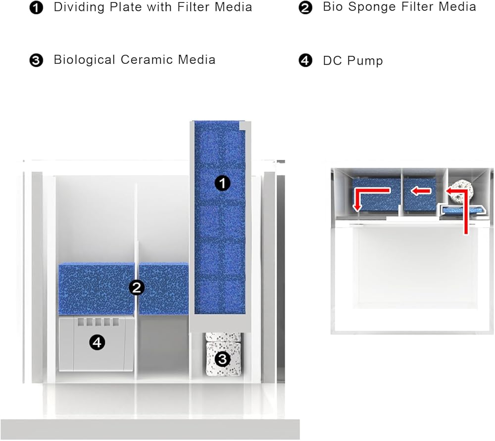 Complete Filtration and Lighting System: Despite its small size, it includes a full set of filtration and lighting systems. The filtration system comprises a water pump, filter cotton, biochemical cotton, and bio-balls, fostering a nitrification system to ensure clear water and the well-being of your fish. The lighting system features an efficient 5-watt LED that provides ample light for plant photosynthesis while enhancing the visual appeal of your aquarium.