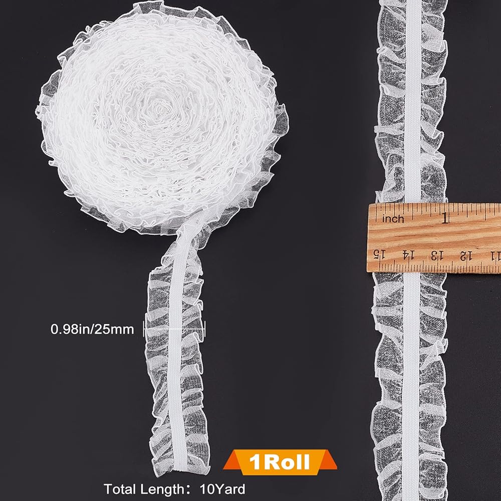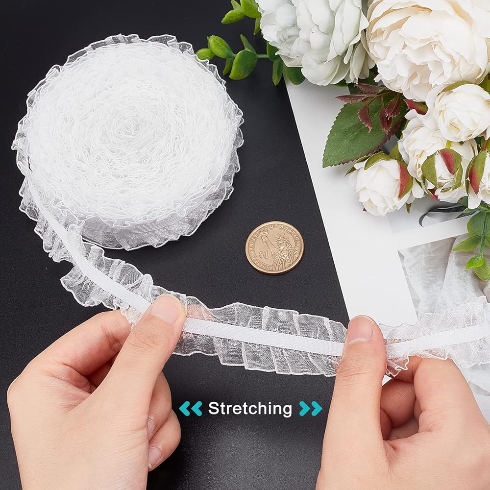 GORGECRAFT 20 Yards Elastic Stretch Lace Trim 25mm Wide Gathered Ruffle Lace White Pleated Organza Fringe Ribbon Edge Trimmings for DIY Sewing Craft Bridal Wedding Garment Skirts Splicing Decoration