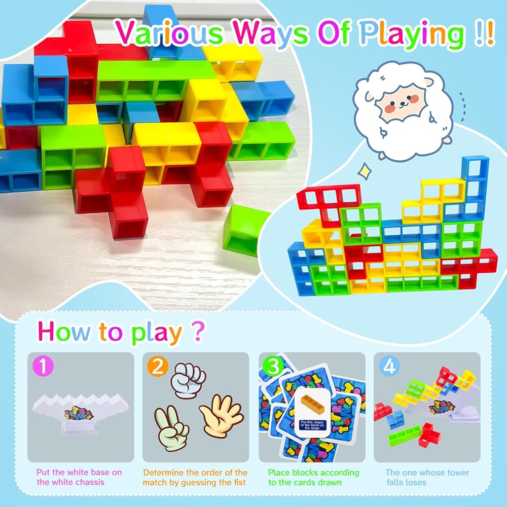 🟦 【Fun and Easy】This Tetra Tower Game is not difficult to play, first gameplay mode: Flat stacking, 3D stacking: children stack one by one, exercise patience, balance, and cultivate the spirit of not giving up easily. Second Fun two-player or multiplayer mode: Place the base evenly on the chassis; Take 22 cards and turn them to the back; Shuffle the cards; Draw a random card; Follow the prompts on the card to the next step. The first one to throw the blocks off balance loses