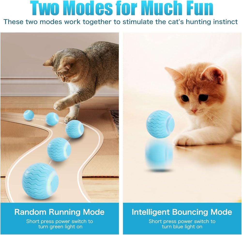 ألعاب القطط الأوتوماتيكية مع وضعين - وضع التشغيل العشوائي مع الضوء الأخضر يتحرك 360 درجة؛ يعد وضع الارتداد مع تشغيل الضوء الأزرق نشطًا للغاية لتلعب قططك بنفسها. يعمل هذان الوضعان معًا لتحفيز غريزة الصيد لدى قطتك.