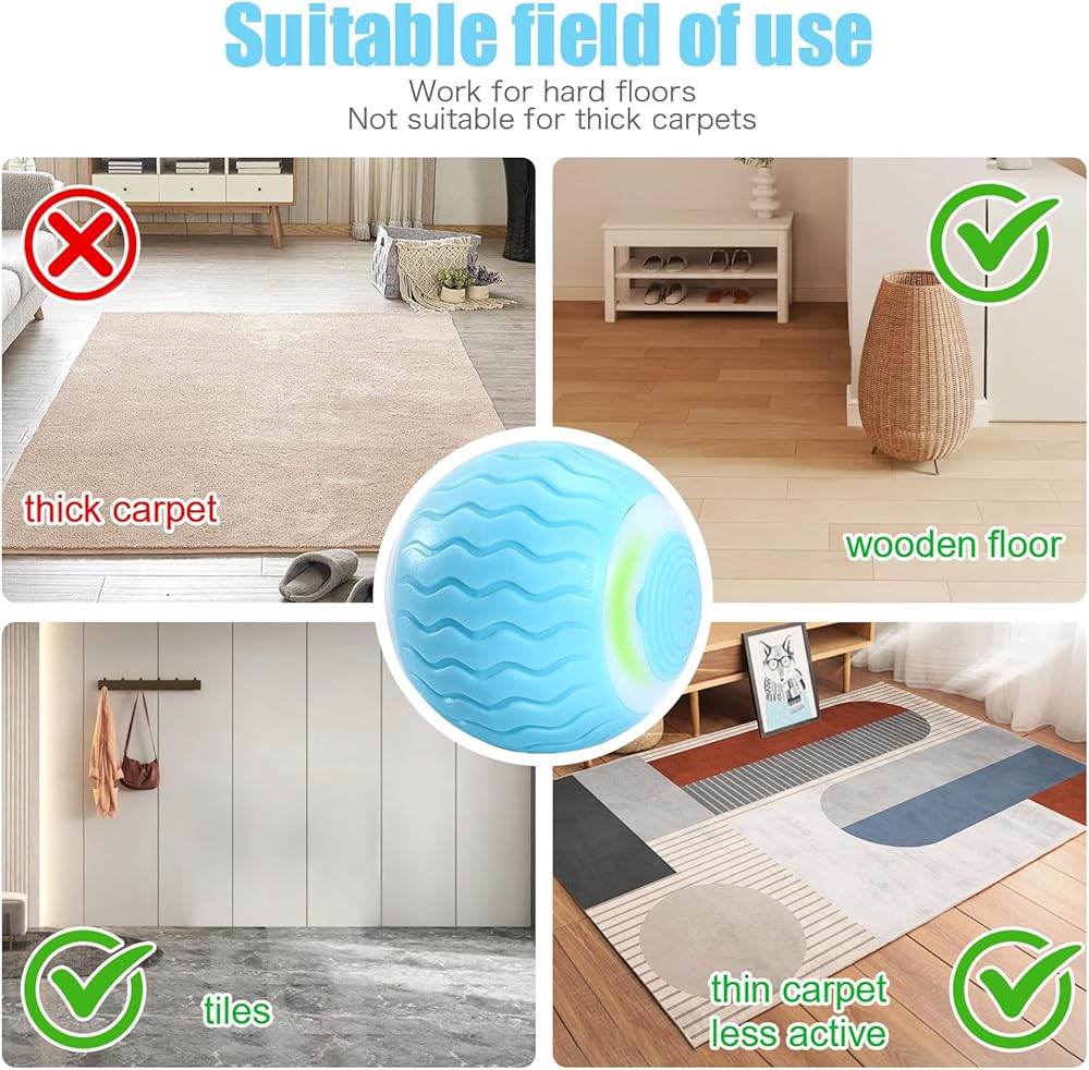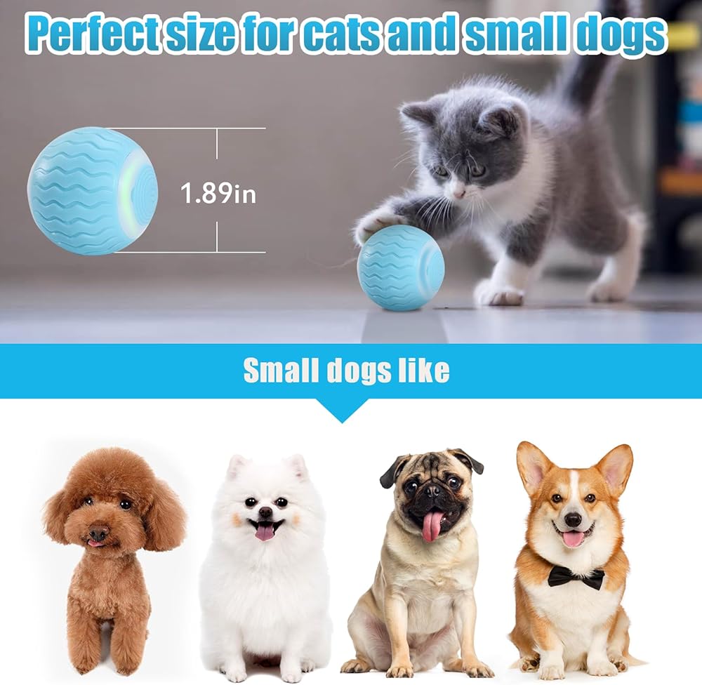 كرة دوارة نشطة للقطط والكلاب الصغيرة: يبلغ حجم لعبة الكرة الدوارة من ICYAIR 1.9 بوصة، وهي مثالية للعب بها القطط والجراء. الكرة الدوارة نشطة على الأرضيات الصلبة، وليس على السجاد السميك.