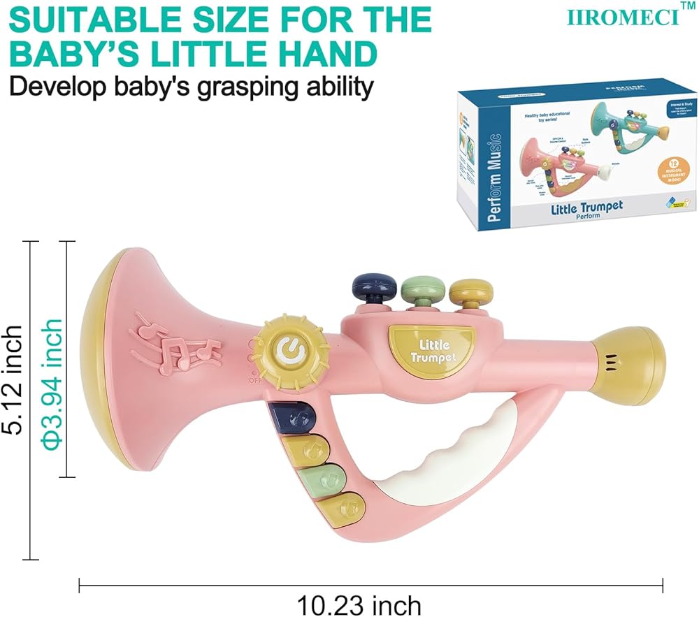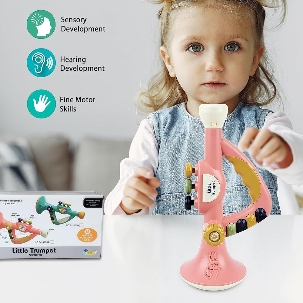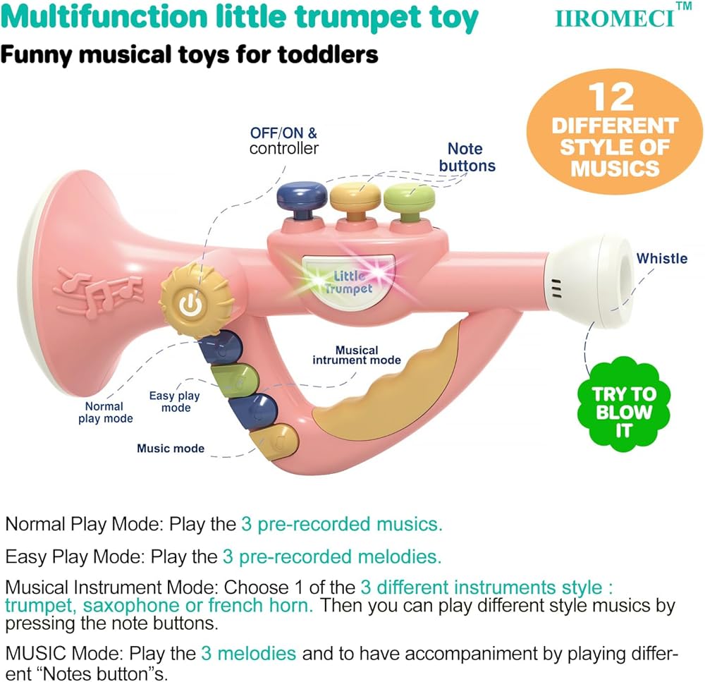 لعبة بوق صغيرة متعددة الوظائف، تحتوي على 12 وضعًا للآلة الموسيقية، و3 أزرار للملاحظات، وأضواء وامضة ملونة ديناميكية، ومفتاح صوت قابل للتعديل. يمكنه تشغيل الألحان الرائعة المسجلة مسبقًا تلقائيًا. يمكنك أيضًا تشغيل الألحان الجميلة يدويًا عن طريق الضغط على أزرار الملاحظات والنفخ في البوق.