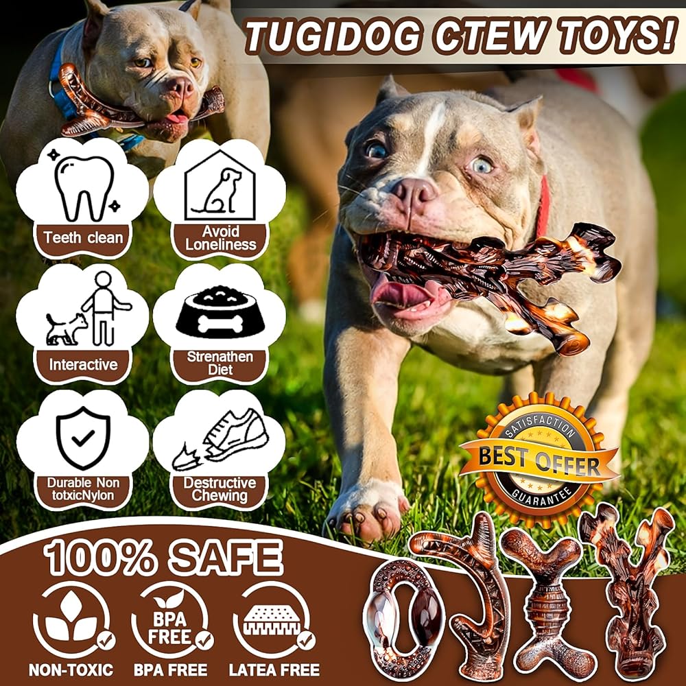 SAFETY & DURABILITY: The safety of our beloved pets is our top priority. Our dog chews are rigorously tested to ensure the highest level of safety for their materials and construction. This durable dog toy is specifically designed for large, medium and small breeds weighing between 25-110 pounds, and it has been thoroughly tested and approved by Alaskan Golden Retrievers, German Shepherds, Labradors and many other aggressive chewers.No chew toy is 100% indestructible, this one comes close.