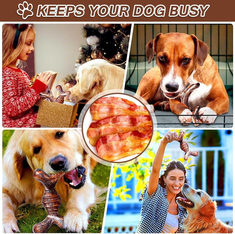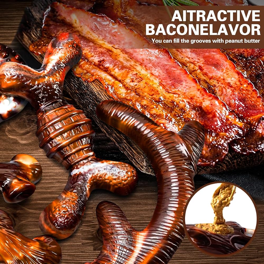 REAL BACON FLAVOR: This dog toy is made using a unique smoking process that infuses it with 100% real bacon flavor. This irresistible scent is sure to attract the attention of any drooling dog. Designed for aggressive chewers, it satisfies their natural chewing instincts while protecting your shoes, sofas and other belongings from scratches and teeth marks. Let your furry friend enjoy every chewing session!