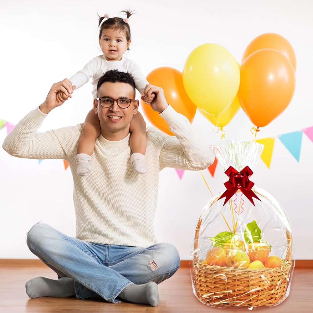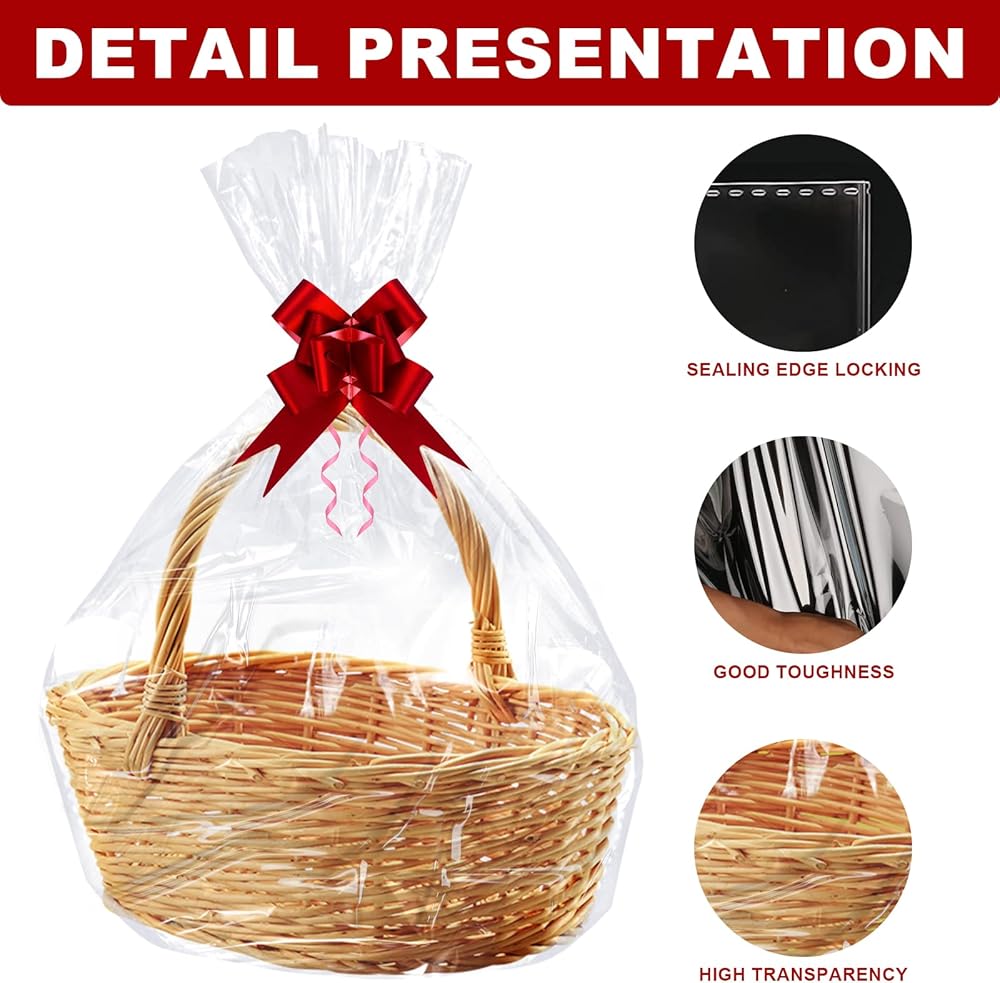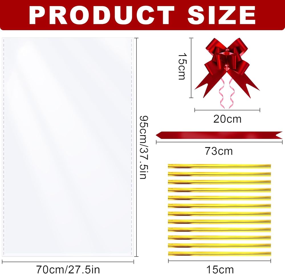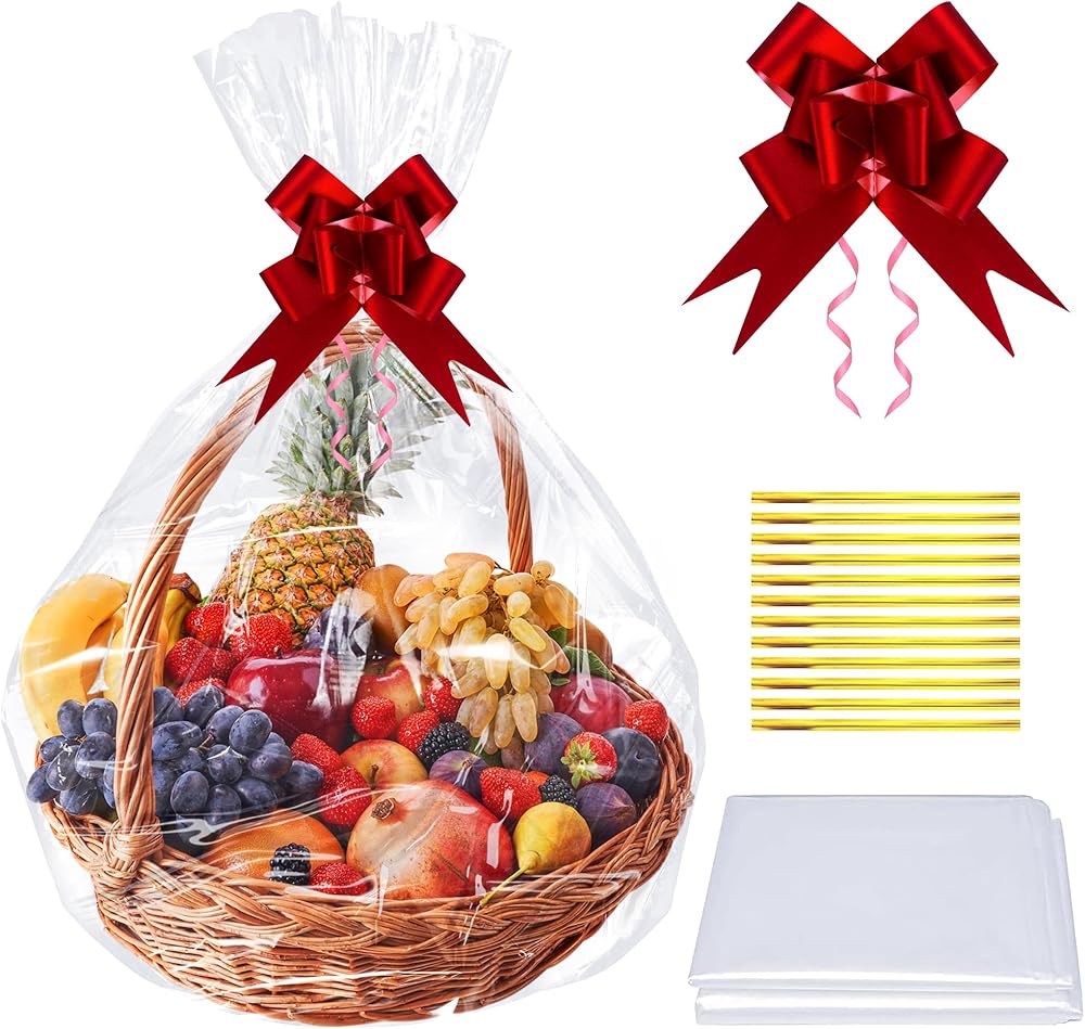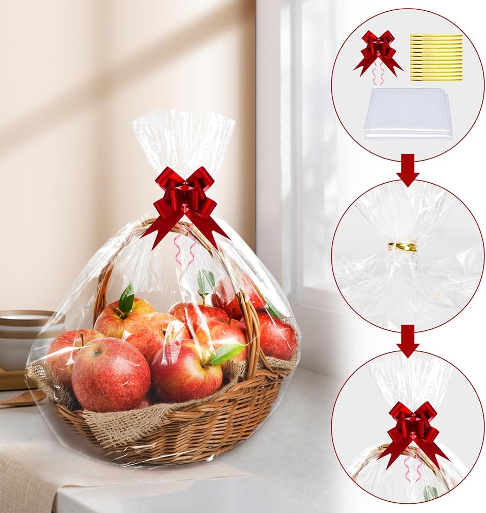 • GIFT BASKET WRAPPING SET: 10 extra large clear cellophane bags, 10 premium red bows (basket not included)