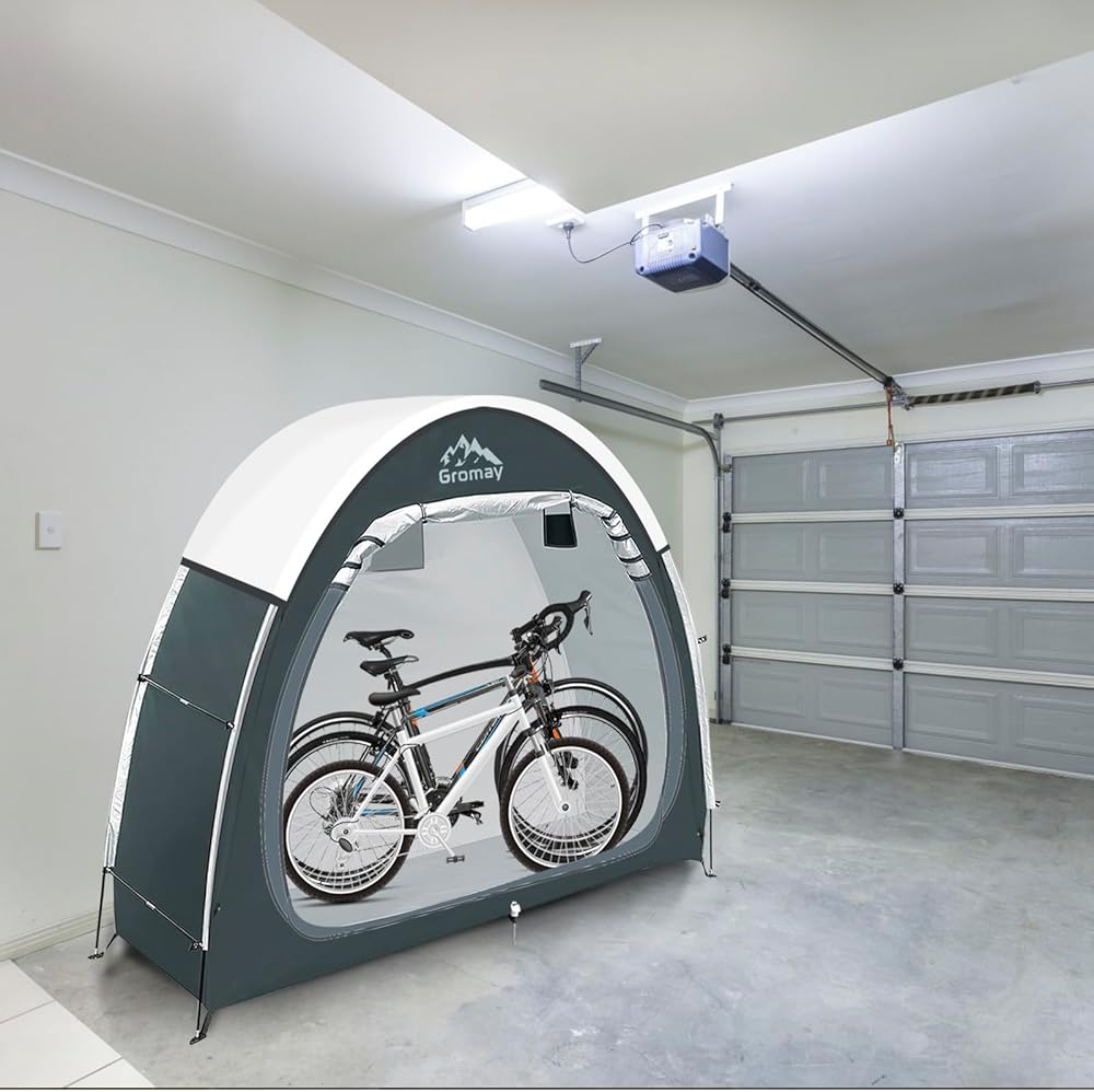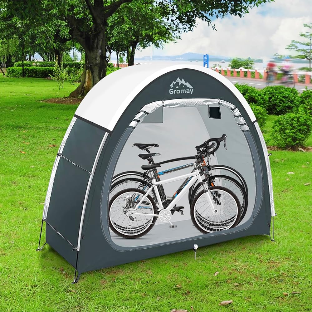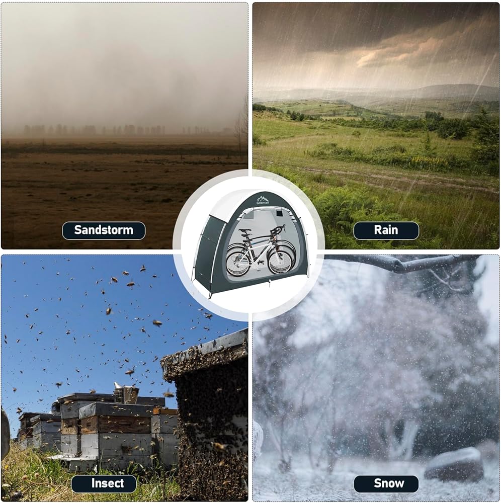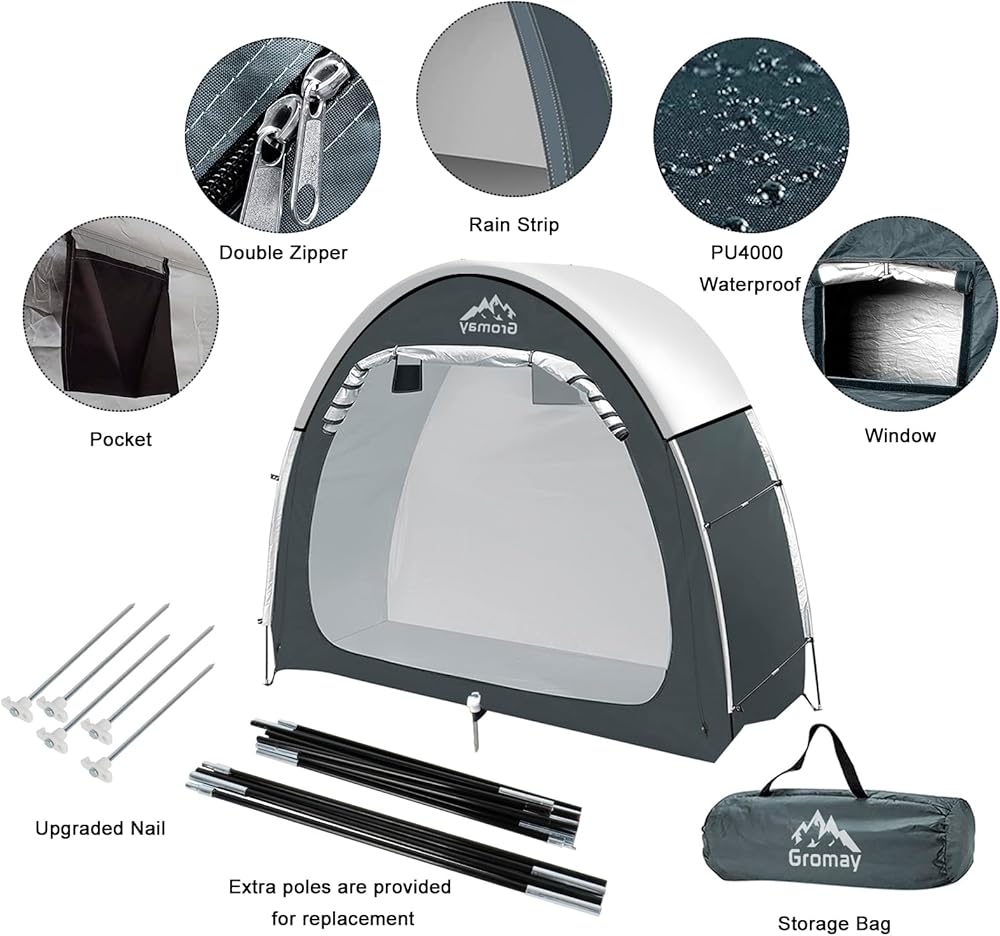 【The Latest Design & Double Door】 This upgraded outdoor bike storage shed is made of thicken silver-plated oxford cloth, so it's very sturdy and highly waterproof and No more worry the problem of outdoor storage. Inserting the nail into the hole reserved at the bottom of the tent will greatly improve its stability. And the new double door design, so that you no longer need to lift the bike as before, just carry out the tent, more quickly and easily.