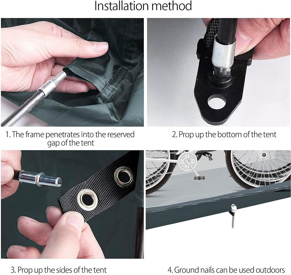 【What You Will Get】 1* outdoor waterproof bike tent, 1*storage bag, 2 galvanized anti-rust long pole, 5* short pole. AND an excellent customer service, please feel free to contact us if you have any questions. (NOTE: Since we have increased the size of the tent, please insert the 4 tent stakes into the ground to achieve the best installation effect.)