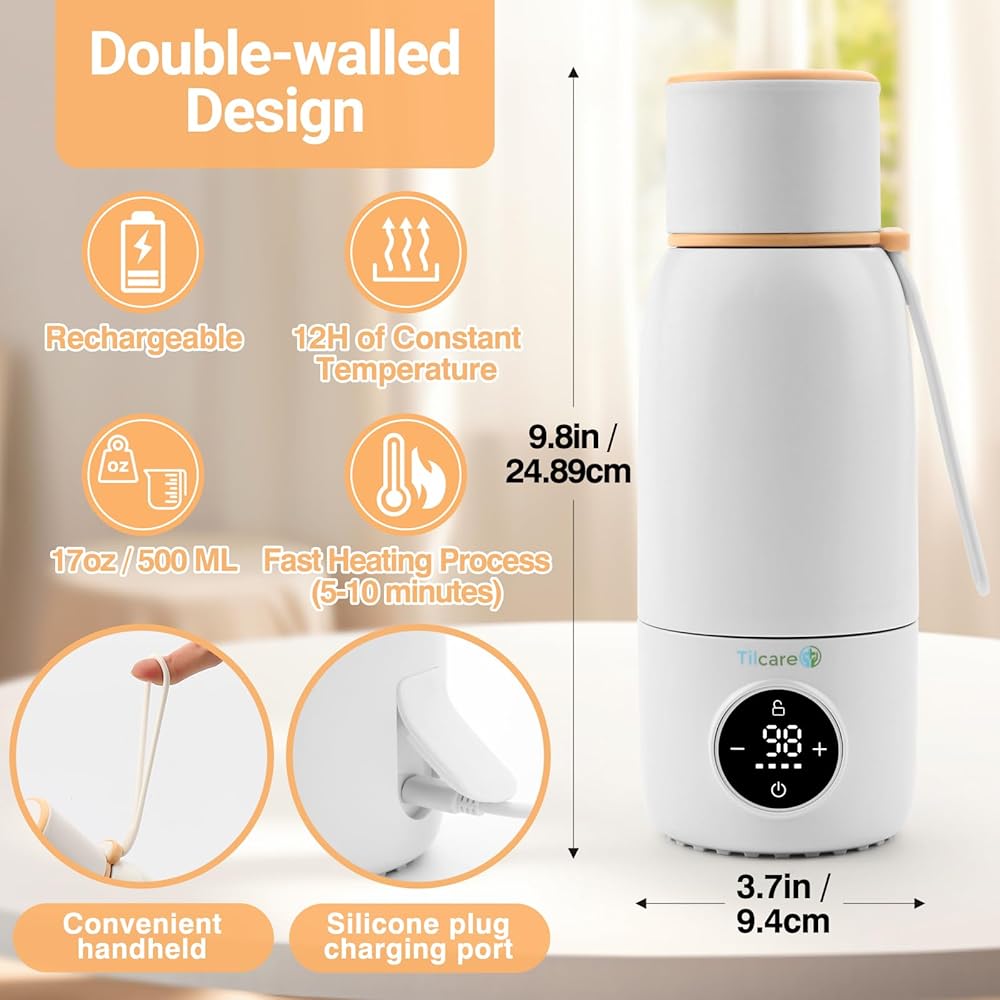 سخان حليب محمول قابل لإعادة الشحن مع موزع تركيبة من تيلكير - 17 أونصة/500 مل، سخان مياه سريع التسخين، تحكم دقيق في درجة الحرارة، سخان حليب يصل إلى 12 ساعة مع شاشة LCD - مثالي للآباء الجدد