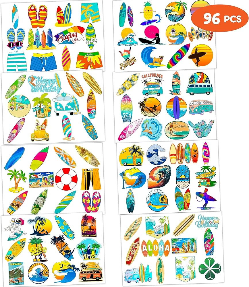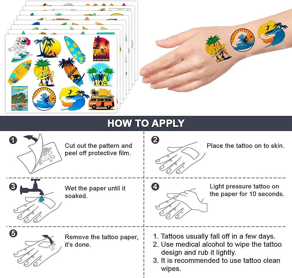 SURF BIRTHDAY PARTY: It belongs to our popular collection and will accommodate your expectations at birthday party, party decorations, and special celebrations. Each tattoo set covers 8 sheets in total with 96 Pcs.The dimension of each sheet is 6.1*3.1 inches, including tattoo pieces that have proportions reasonable for adults to kids. Our tattoo stickers designed in different styles promise to develop the impression for the party ^^