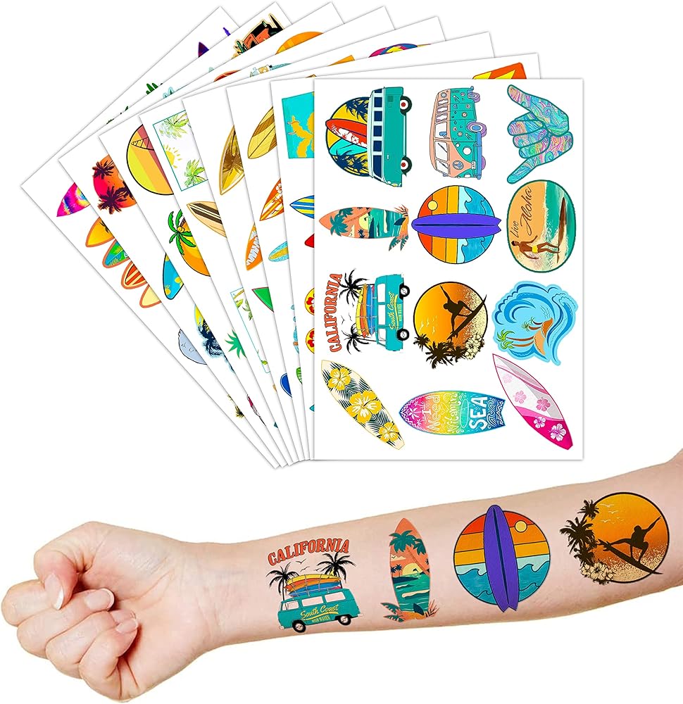 SURF TATTOOS: If you haven't had the option for a SURF theme birthday party yet, SURF temporary tattoos complete with themed aloha SURFboard styles, summer stuff for beachgoers, and SURFing will be a terrific choice for you on their momentous day. Sure enough to believe that kids have fun a lot of when playing with our tattoo stickers. The tattoo is the best gift for a birthday party together with the important meaning that it says ^^